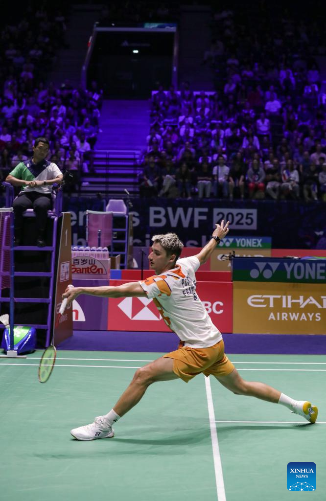 Christo Popov competes during the men's singles third round match between Shi Yuqi of China and Christo Popov of France at the BWF World Championships 2025 in Paris, France, Aug. 28, 2025. (Xinhua/Zhang Fan)