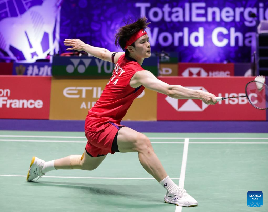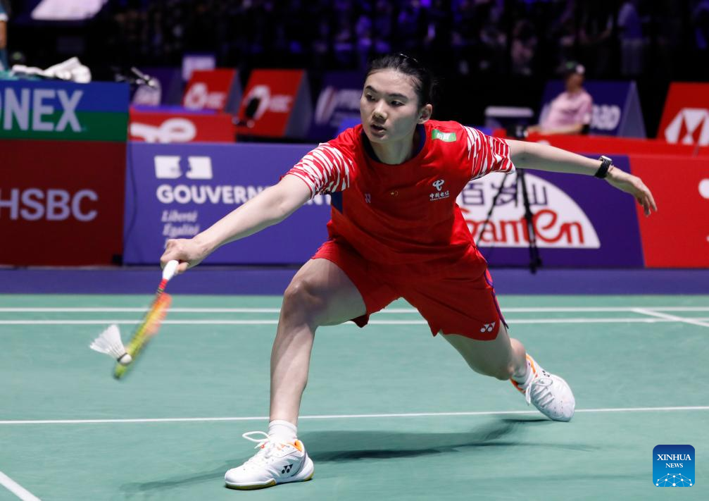 Wang Zhiyi of China competes during the women's singles third round match between Wang Zhiyi of China and Pusarla V. Sindhu of India at the BWF World Championships 2025 in Paris, France, Aug. 28, 2025. (Xinhua/Zhang Fan)