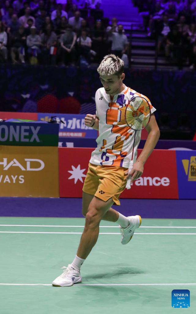 Shi Yuqi celebrates after the men's singles third round match between Shi Yuqi of China and Christo Popov of France at the BWF World Championships 2025 in Paris, France, Aug. 28, 2025. (Xinhua/Zhang Fan)