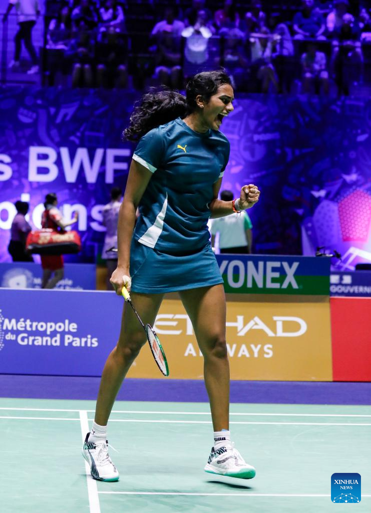 Pusarla V. Sindhu of India celebrates during the women's singles third round match between Wang Zhiyi of China and Pusarla V. Sindhu of India at the BWF World Championships 2025 in Paris, France, Aug. 28, 2025. (Xinhua/Zhang Fan)