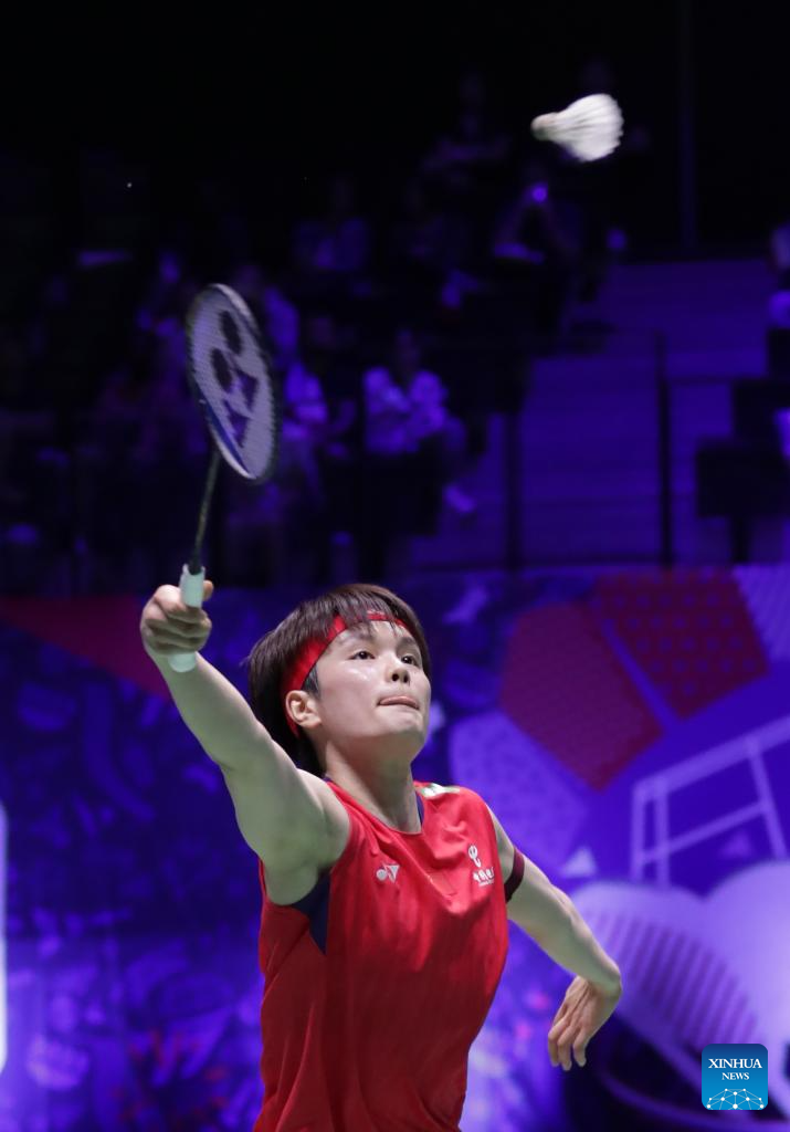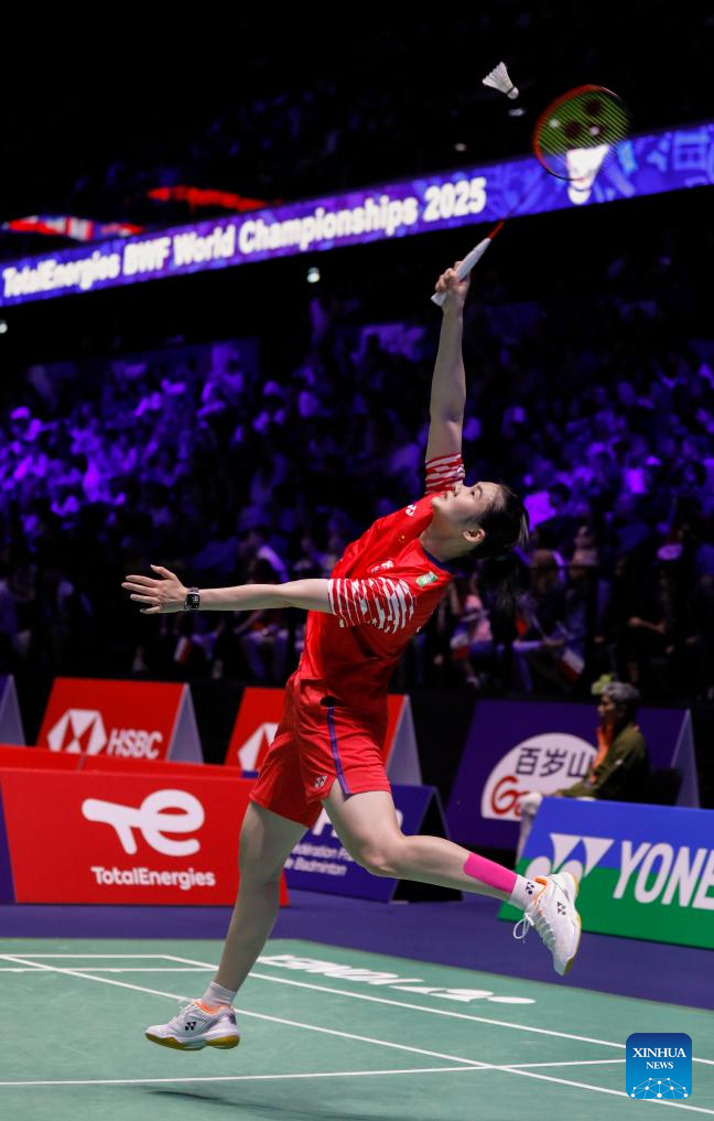 Han Yue of China competes during the women's singles third round match between Han Yue of China and Gao Fangjie of China at the BWF World Championships 2025 in Paris, France, Aug. 28, 2025. (Xinhua/Zhang Fan)