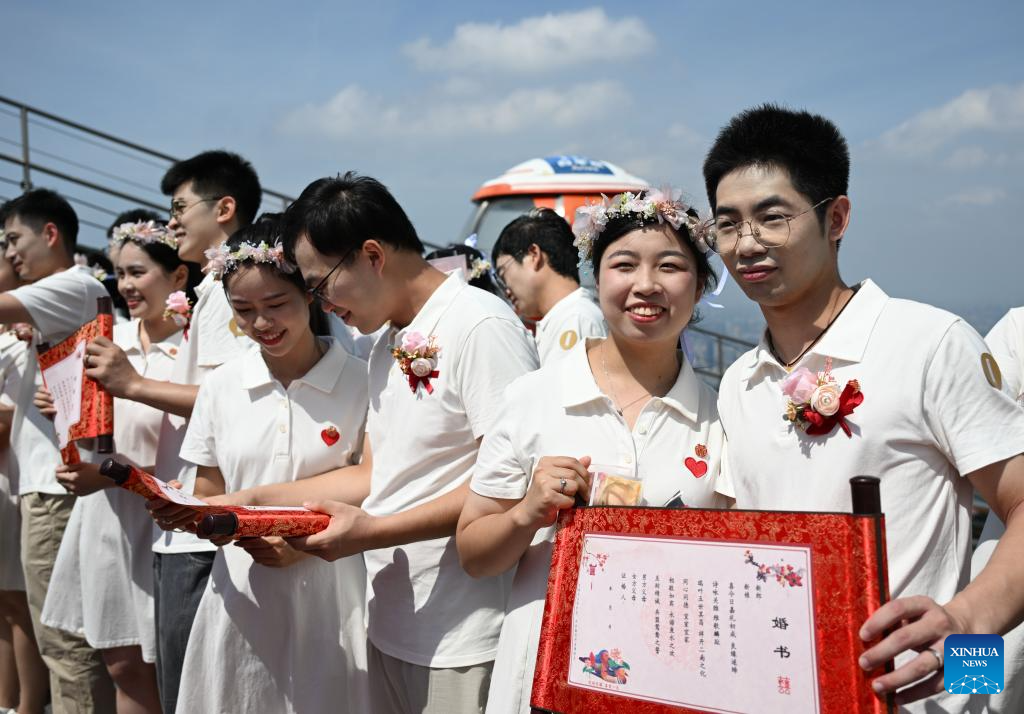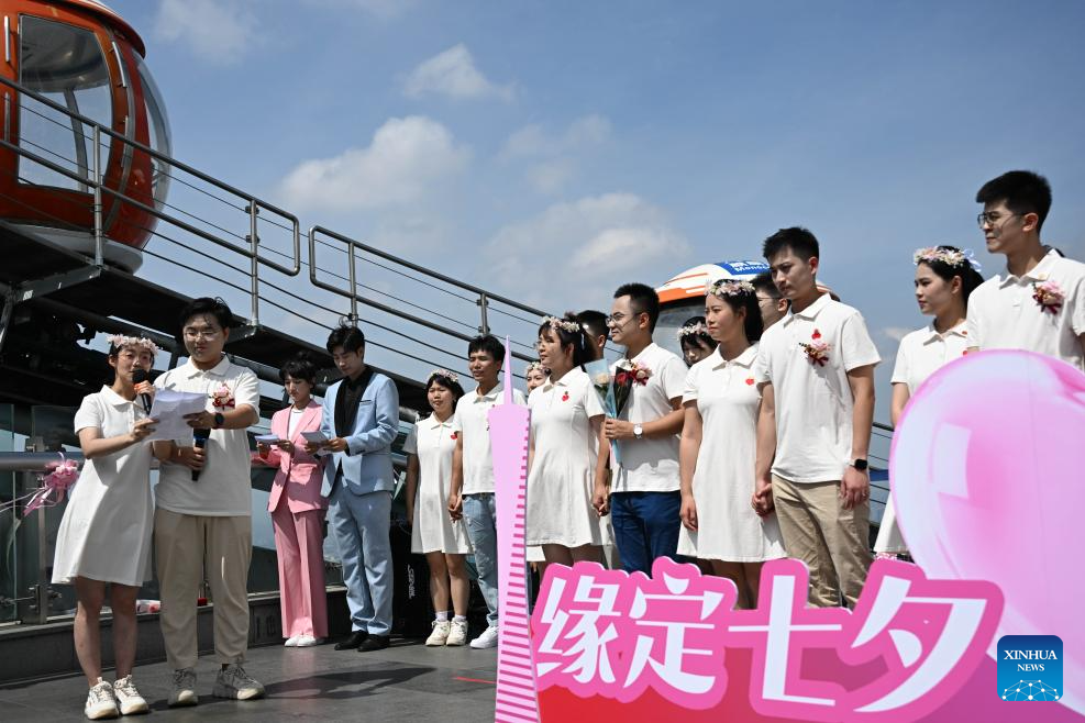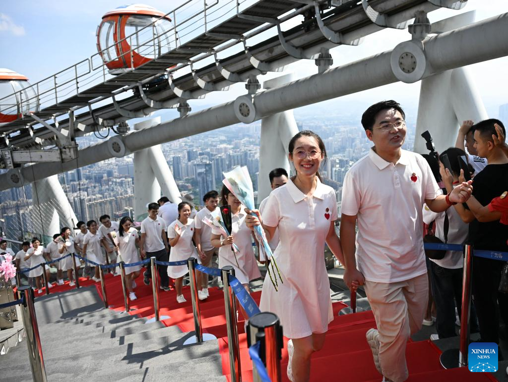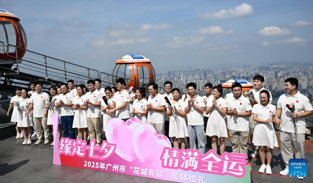 Couples participate in a group wedding held at the Canton Tower in Guangzhou, south China's Guangdong Province, Aug. 29, 2025. Fifteen couples participated in a group wedding here on the Qixi Festival, also known Chinese Valentine's Day, which falls on Friday this year. (Xinhua/Deng Hua)