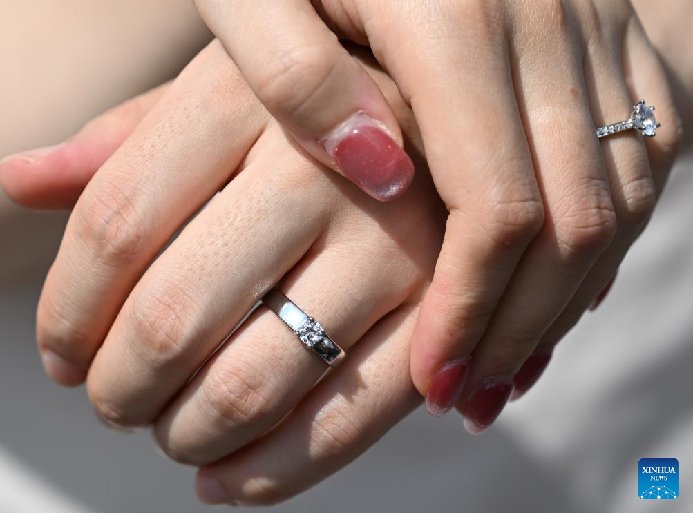 A couple shows their rings during a group wedding held at the Canton Tower in Guangzhou, south China's Guangdong Province, Aug. 29, 2025. Fifteen couples participated in a group wedding here on the Qixi Festival, also known Chinese Valentine's Day, which falls on Friday this year. (Xinhua/Deng Hua)