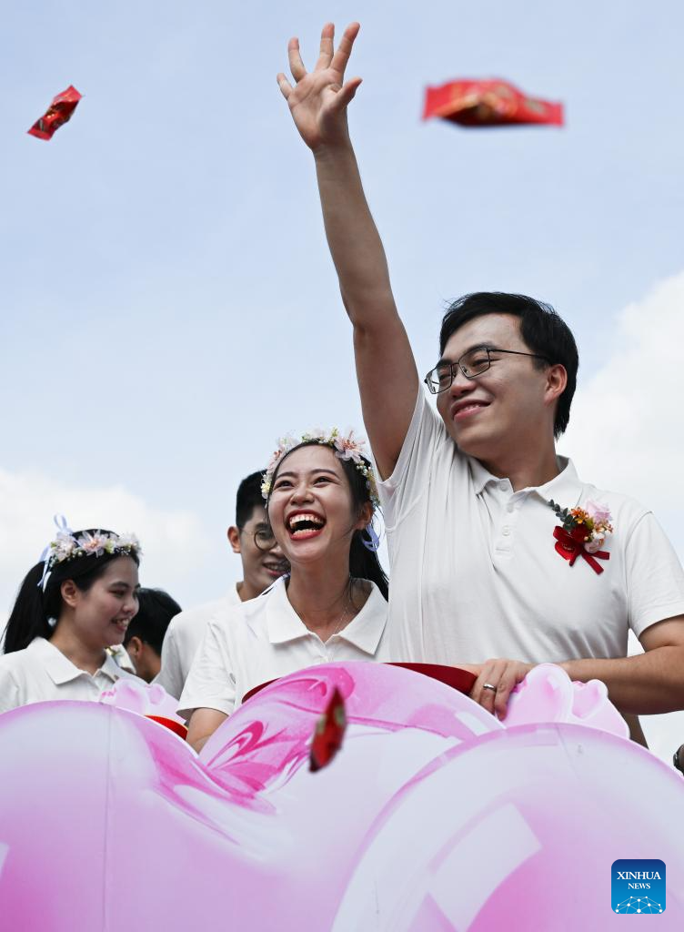 A couple throws wedding candies into the air during a group wedding held at the Canton Tower in Guangzhou, south China's Guangdong Province, Aug. 29, 2025. Fifteen couples participated in a group wedding here on the Qixi Festival, also known Chinese Valentine's Day, which falls on Friday this year. (Xinhua/Deng Hua)