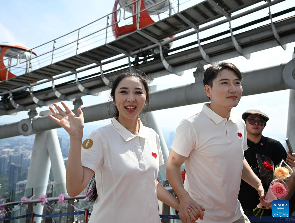 A couple participates in a group wedding held at the Canton Tower in Guangzhou, south China's Guangdong Province, Aug. 29, 2025. Fifteen couples participated in a group wedding here on the Qixi Festival, also known Chinese Valentine's Day, which falls on Friday this year. (Xinhua/Deng Hua)