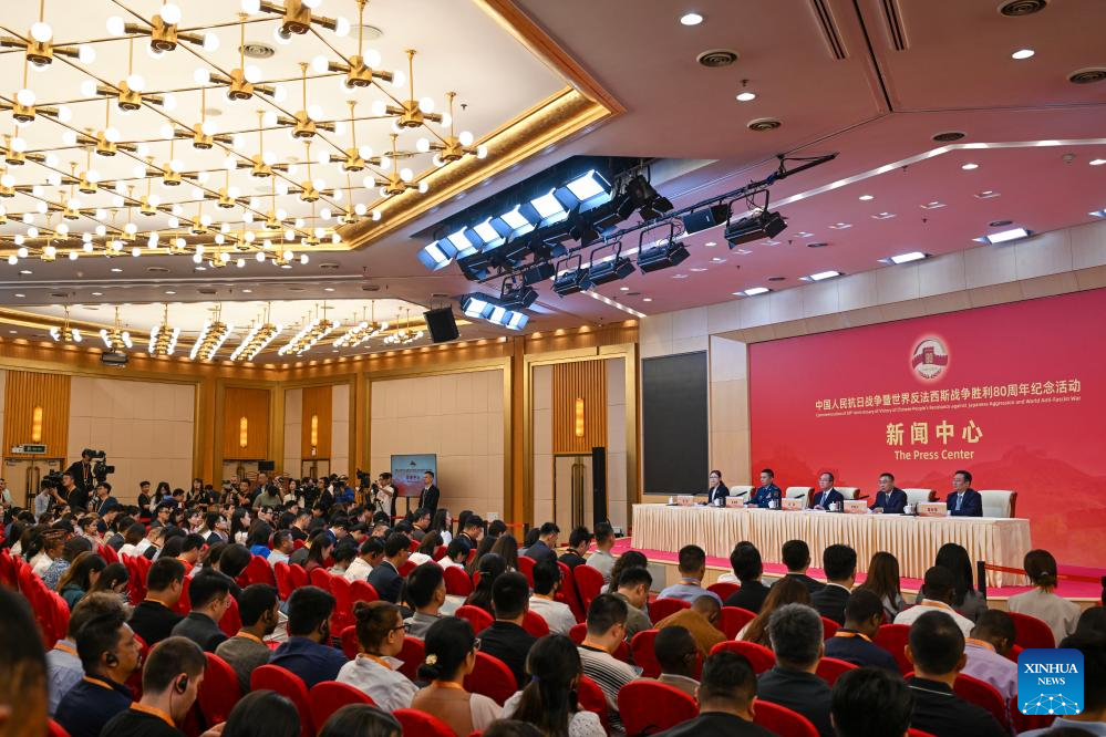 The first press conference on preparations for the V-Day commemorations is held by the press center of Commemoration of 80th Anniversary of Victory of Chinese People's Resistance against Japanese Aggression and World Anti-Fascist War in Beijing, capital of China, Aug. 28, 2025. Assistant Foreign Minister Hong Lei, Vice Minister of Culture and Tourism Lu Yingchuan, Wu Zeke, deputy director of the Office of the Leading Group for the Military Parade and a senior officer of the Joint Staff Department of the Central Military Commission (CMC) and Xia Linmao, executive vice mayor of Beijing attended the press conference. (Xinhua/Jin Liangkuai)
