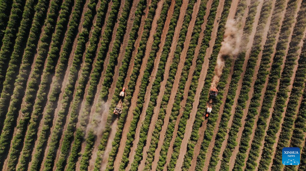 An aerial drone photo taken on Aug. 27, 2025 shows people harvesting coffee beans at a coffee manor in a coffee producing region known as the Cerrado Mineiro, in Minas Gerais state, Brazil. Brazil is one of the world's largest coffee producers. The Cerrado Mineiro region in Minas Gerais state has a total planting area of about 210,000 hectares, producing an average of 5 million bags of coffee annually, which accounts for approximately 13 percent of the country's total output. (Xinhua/Wang Tiancong)
