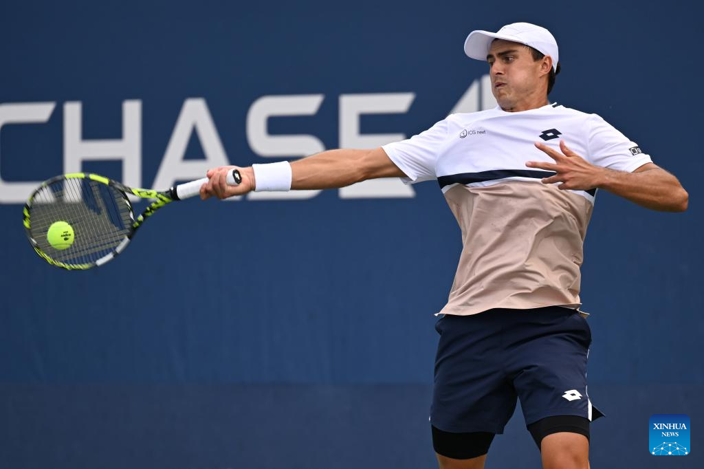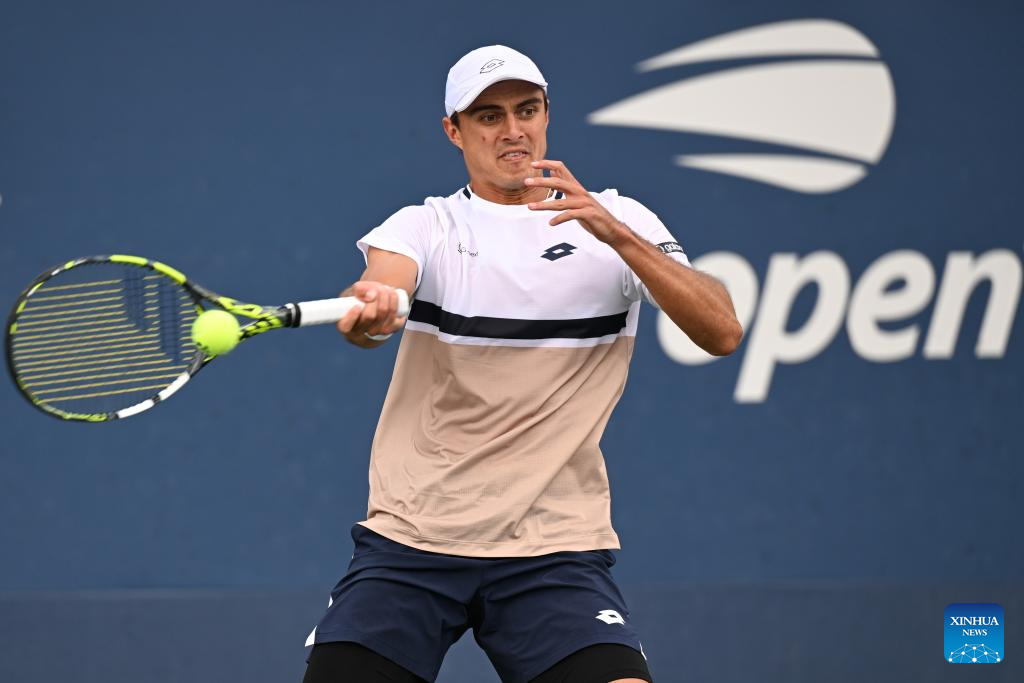 Adam Walton of Australia hits a return during the men's singles second round match between Coleman Wong of China's Hong Kong and Adam Walton of Australia at the 2025 US Open tennis championships in New York, the United States, Aug. 28, 2025. (Xinhua/Li Rui)