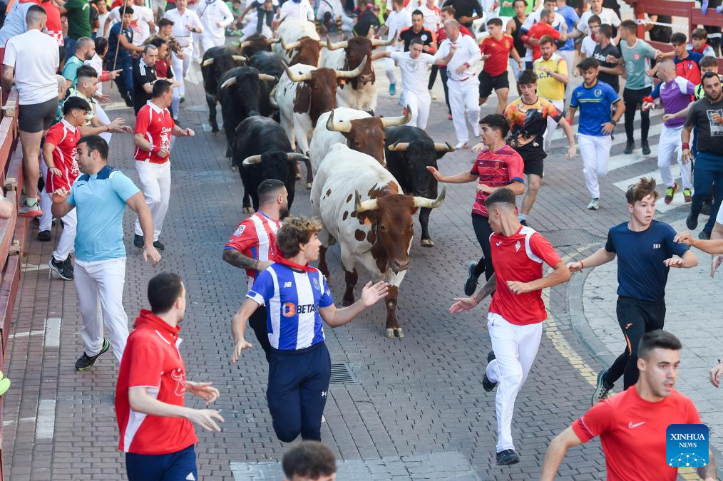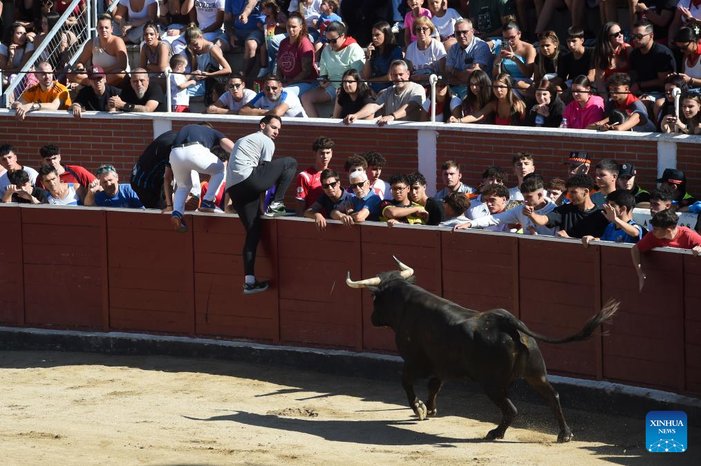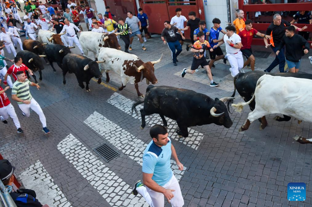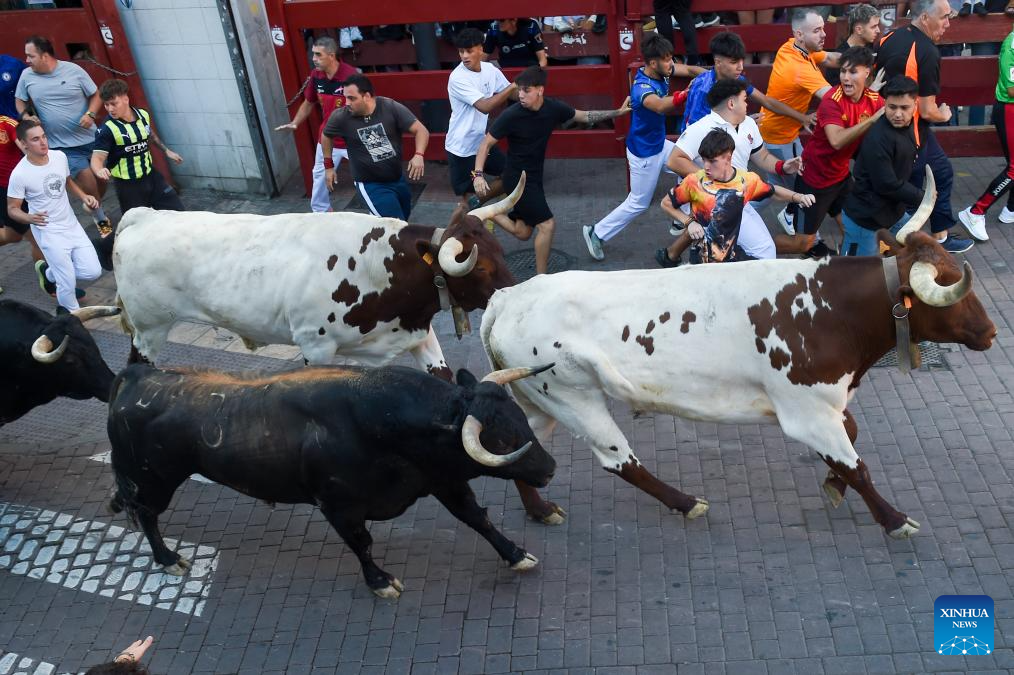 People attend the Bull Run on a street of San Sebastian de los Reyes, Spain, on Aug. 28, 2025. The annual Bull Run fiesta is held here in the last week of August. (Photo by Gustavo Valiente/Xinhua)