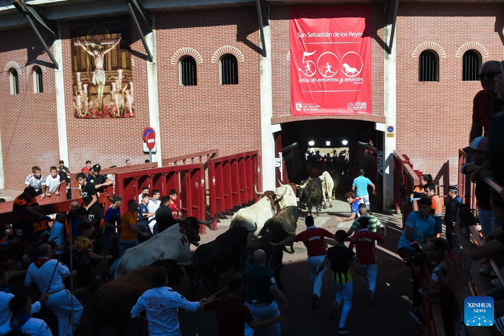 People and a herd of bulls arrive at a bullring during the Bull Run in San Sebastian de los Reyes, Spain, on Aug. 28, 2025. The annual Bull Run fiesta is held here in the last week of August. (Photo by Gustavo Valiente/Xinhua)