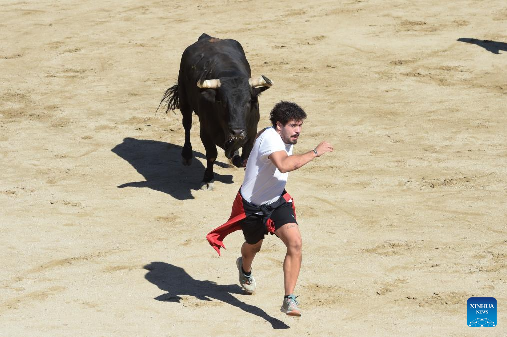 A man participating in the Bull Run avoids a bull in San Sebastian de los Reyes, Spain, on Aug. 28, 2025. The annual Bull Run fiesta is held here in the last week of August. (Photo by Gustavo Valiente/Xinhua)