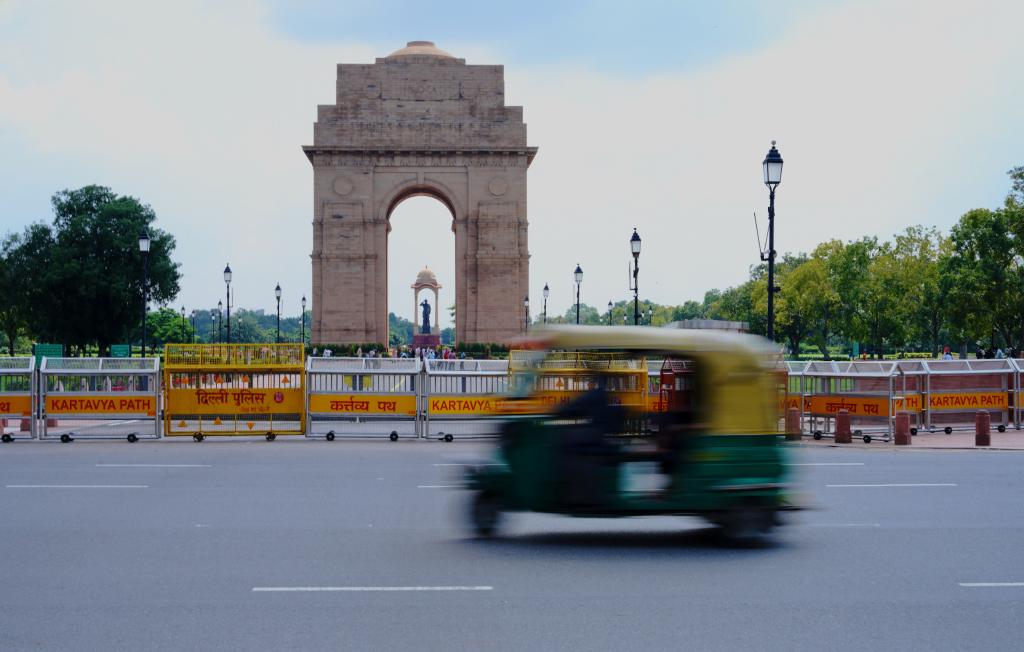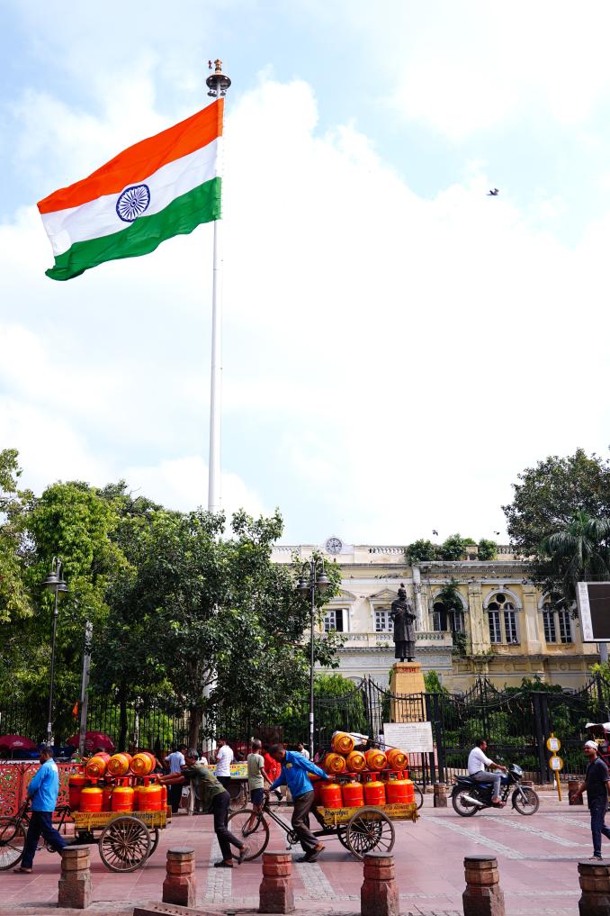 This photo taken on Aug. 21, 2025 shows a street view in New Delhi, India. India boasts a diverse and rich culture, attracting global attention with its historical heritage, Bollywood film industry, yoga culture, and more. (Xinhua/Chen Dongshu)