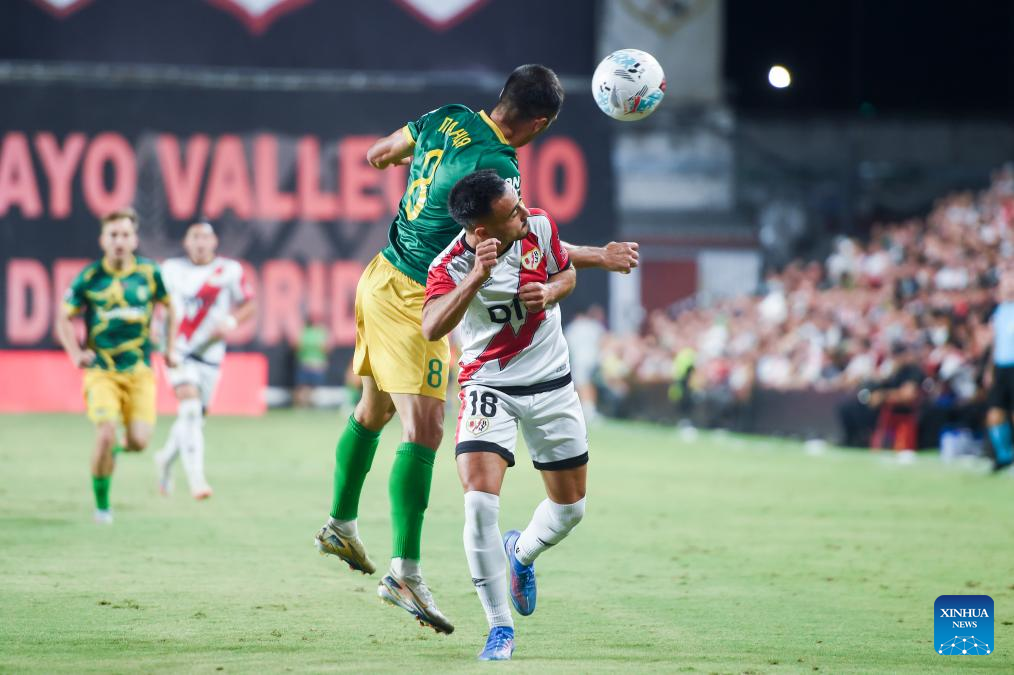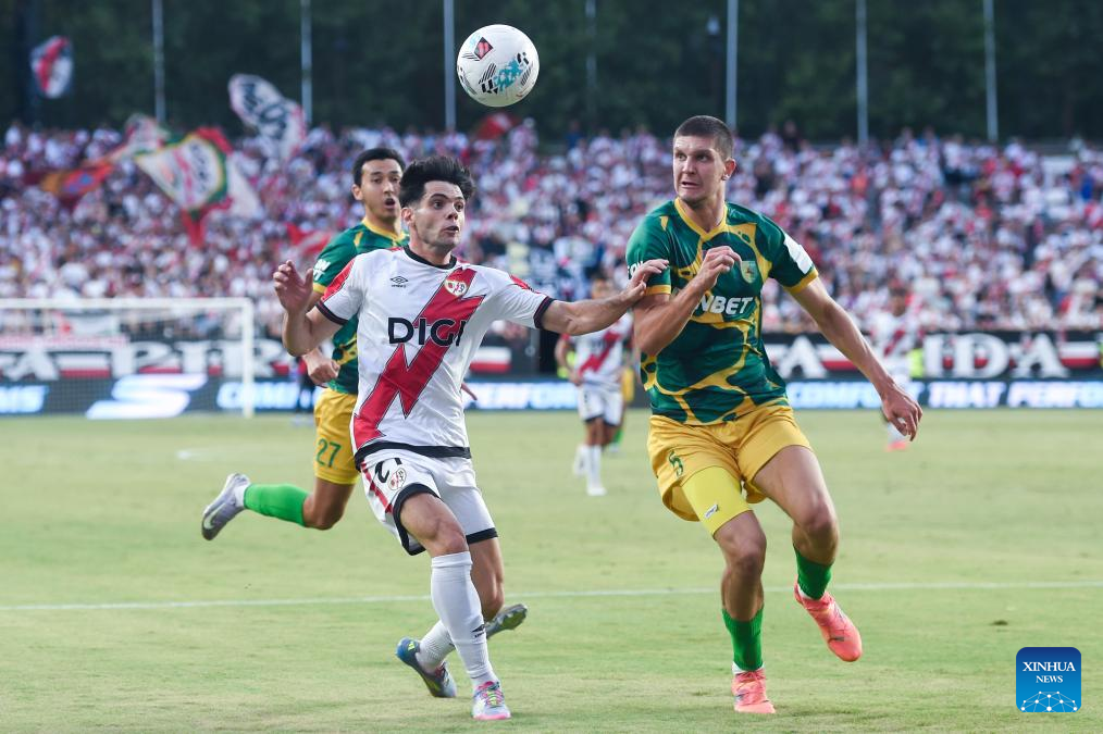 Randy Nteka (R) of Rayo Vallecano vies with Ivan Sadovnichi of FC Neman Grodno during the play-off 2nd leg match of the UEFA Conference League between Rayo Vallecano of Spain and FC Neman Grodno of Belarus in Madrid, Spain, Aug. 28, 2025. (Photo by Gustavo Valiente/Xinhua)
