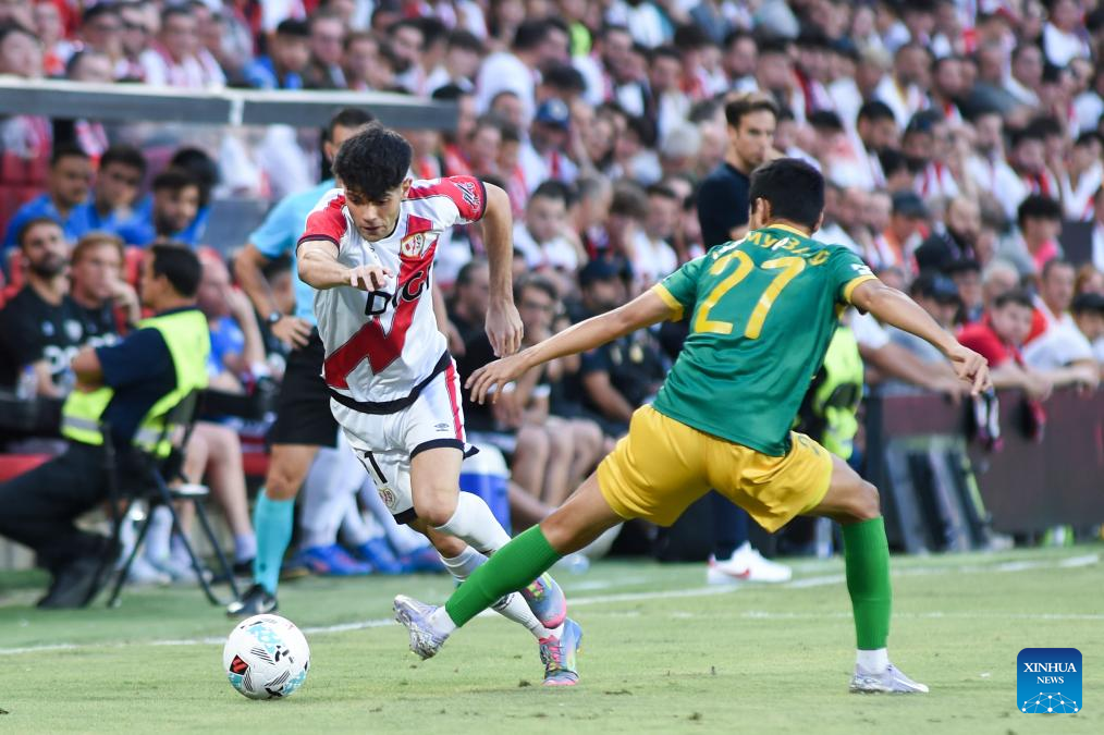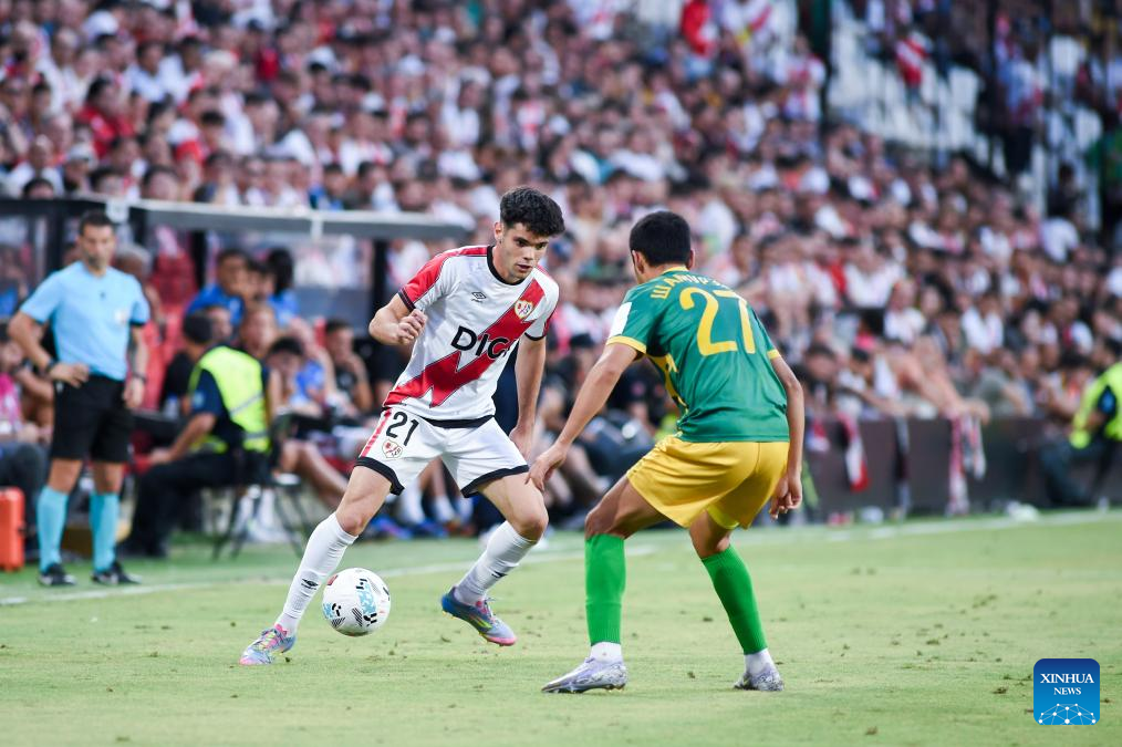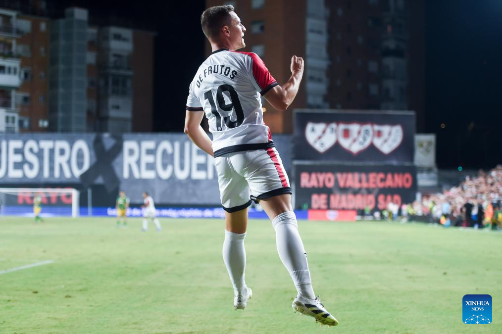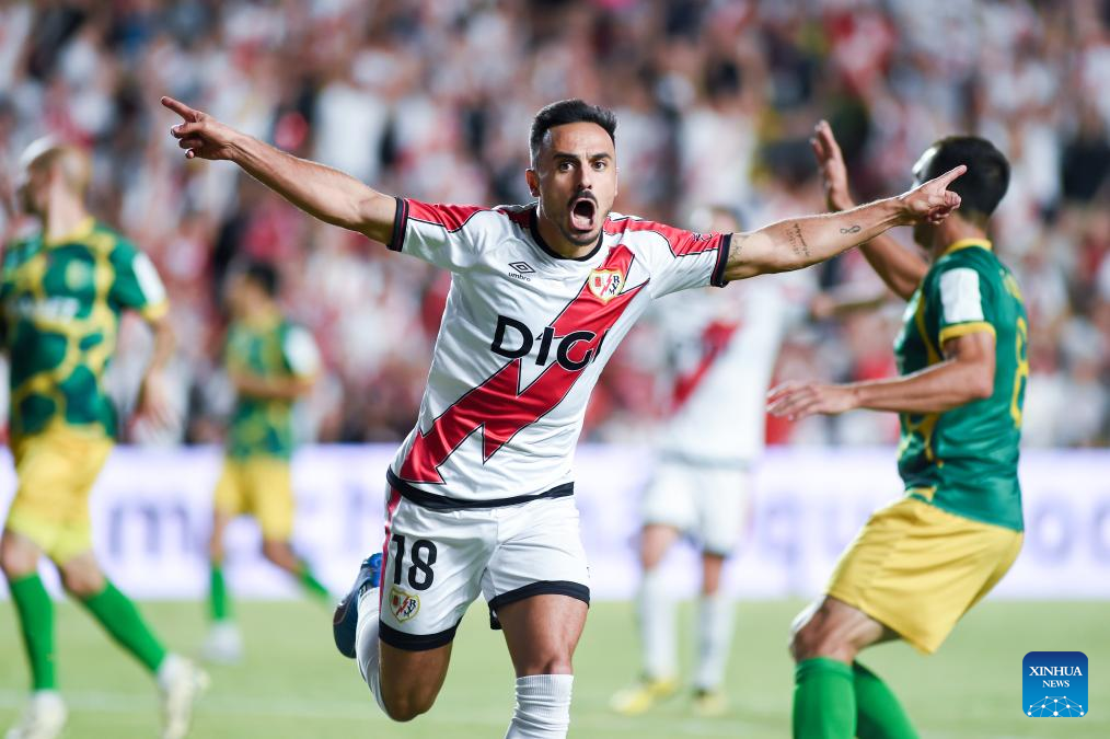 Jorge De Frutos of Rayo Vallecano celebrates a goal during the play-off 2nd leg match of the UEFA Conference League between Rayo Vallecano of Spain and FC Neman Grodno of Belarus in Madrid, Spain, Aug. 28, 2025. (Photo by Gustavo Valiente/Xinhua)