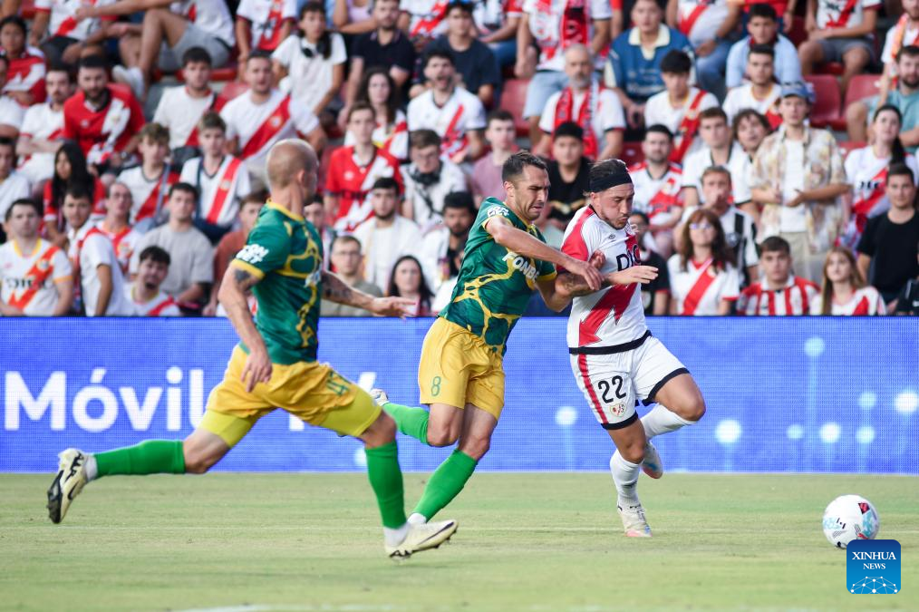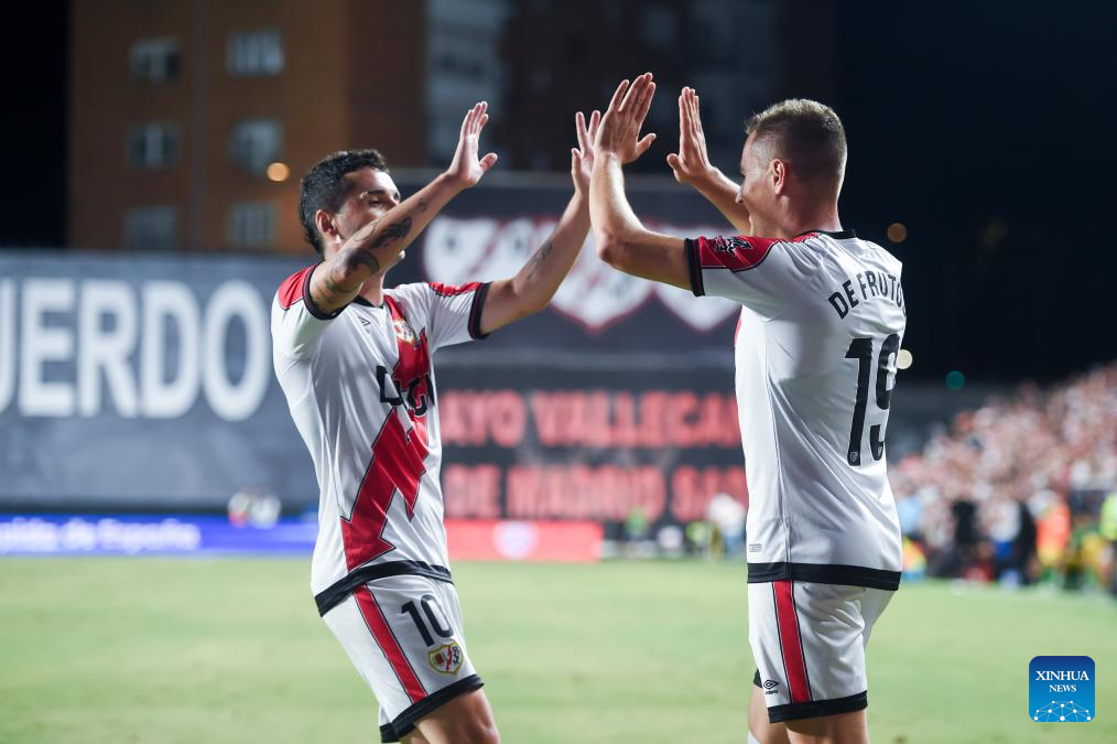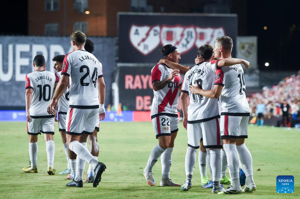 Players of Rayo Vallecano celebrate a goal during the play-off 2nd leg match of the UEFA Conference League between Rayo Vallecano of Spain and FC Neman Grodno of Belarus in Madrid, Spain, Aug. 28, 2025. (Photo by Gustavo Valiente/Xinhua)