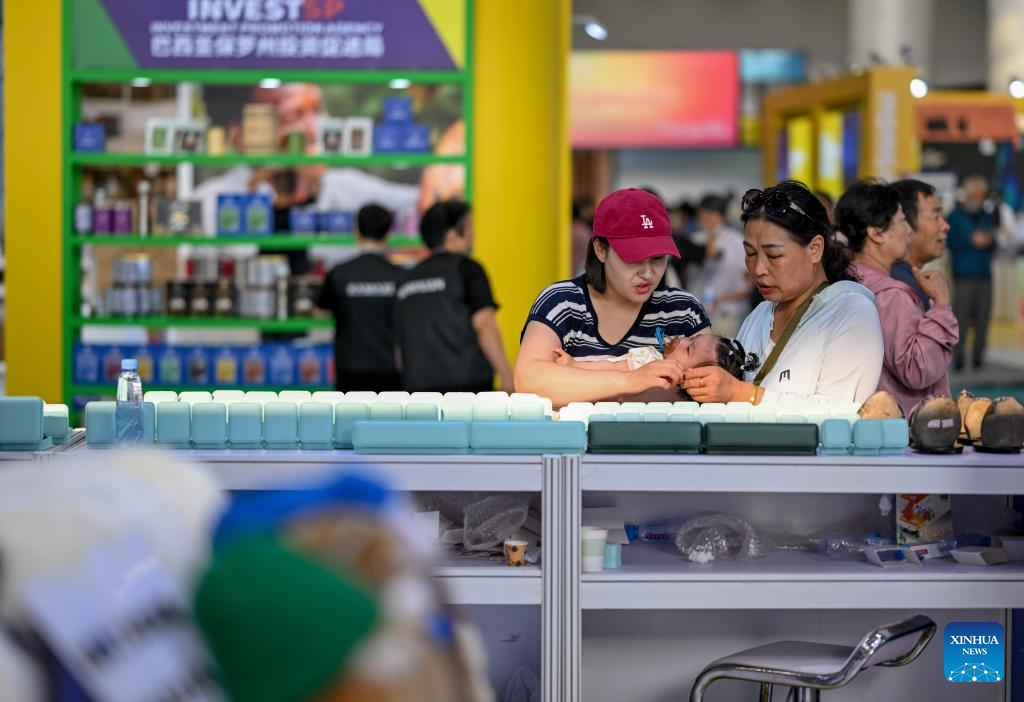 People select products at the exhibition area of Mongolia during the 5th China-Mongolia Expo in Hohhot, north China's Inner Mongolia Autonomous Region, Aug. 29, 2025. The ongoing 5th China-Mongolia Expo, which kicked off on Aug. 25, has attracted over 1,500 exhibitors from home and abroad. (Xinhua/Lian Zhen)
