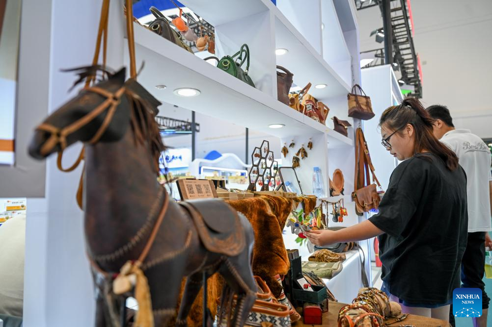 People select products at the 5th China-Mongolia Expo in Hohhot, north China's Inner Mongolia Autonomous Region, Aug. 29, 2025. The ongoing 5th China-Mongolia Expo, which kicked off on Aug. 25, has attracted over 1,500 exhibitors from home and abroad. (Xinhua/Lian Zhen)