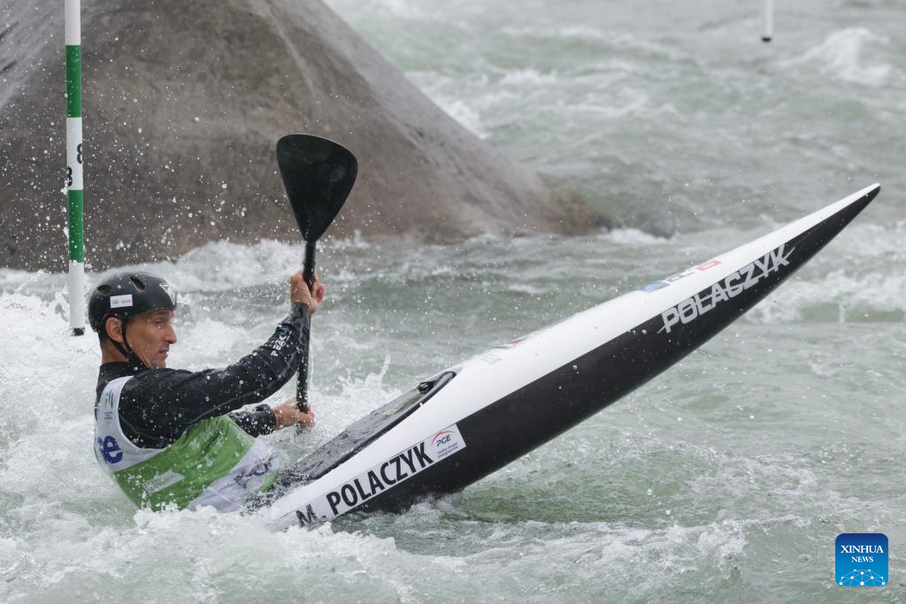 Mateusz Polaczyk of Poland competes during the Men's Kayak final at 2025 ICF Canoe Slalom World Cup Tacen in Ljubljana, Slovenia, Aug. 29, 2025. (Photo by Zeljko Stevanic/Xinhua)