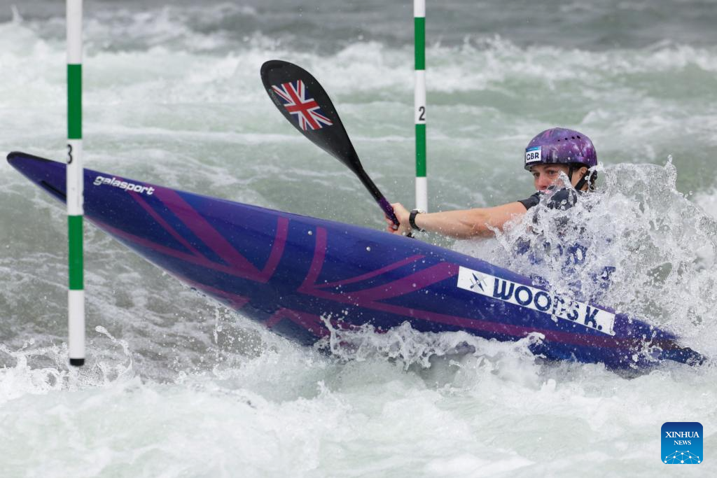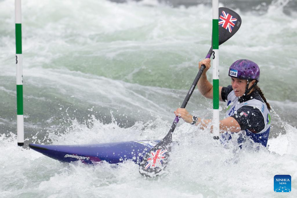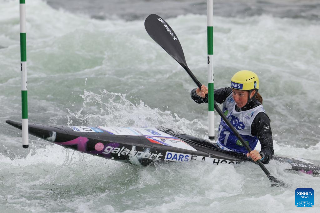 Kimberly Woods of Britain competes during the Women's Kayak final at 2025 ICF Canoe Slalom World Cup Tacen in Ljubljana, Slovenia, Aug. 29, 2025. (Photo by Zeljko Stevanic/Xinhua)