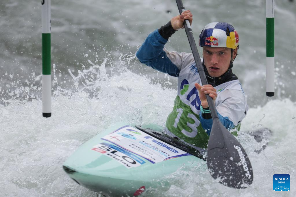 Ziga Lin Hocevar of Slovenia competes during the Men's Kayak final at 2025 ICF Canoe Slalom World Cup Tacen in Ljubljana, Slovenia, Aug. 29, 2025. (Photo by Zeljko Stevanic/Xinhua)