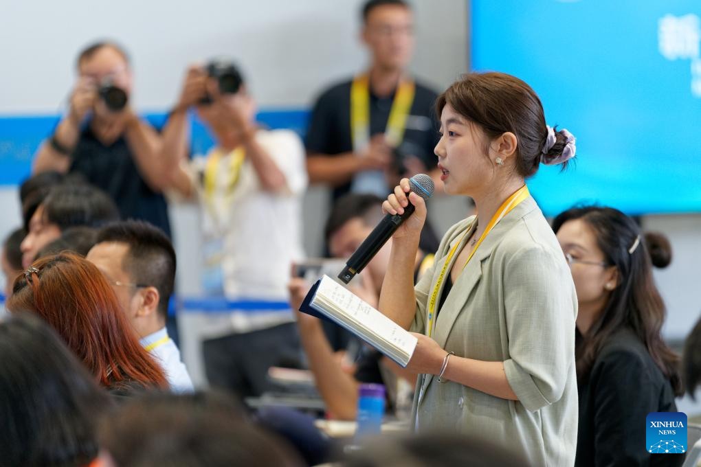 A journalist asks questions during a press briefing of the Ministry of Ecology and Environment of China for the Shanghai Cooperation Organization (SCO) Summit 2025 on the cooperation on ecological and environmental issues of the SCO at Tianjin Meijiang Convention Center in north China's Tianjin, Aug. 30, 2025. The press briefing was held here by the media center of SCO Summit 2025 on Saturday. (Xinhua/Zhang Xiaoyu)