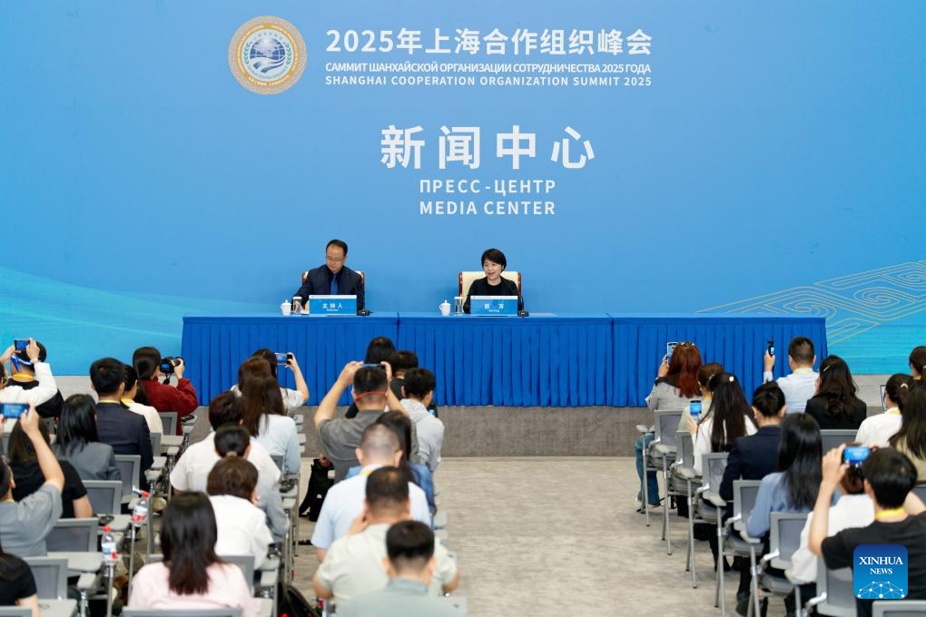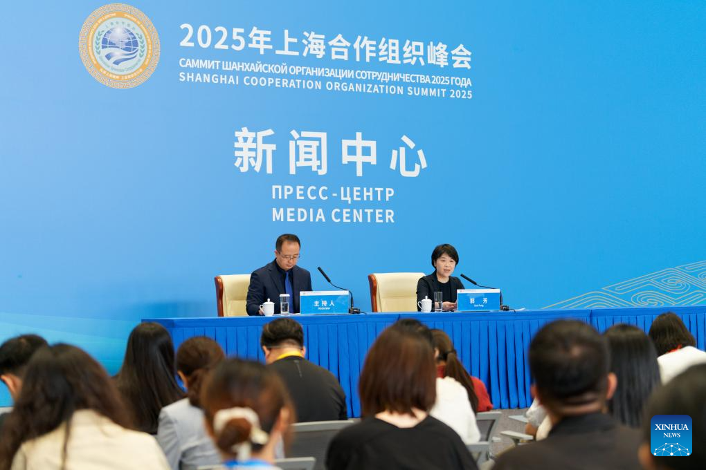 Guo Fang (R, back), vice minister of the Ministry of Ecology and Environment, speaks during a press briefing of the ministry for the Shanghai Cooperation Organization (SCO) Summit 2025 on the cooperation on ecological and environmental issues of the SCO at Tianjin Meijiang Convention Center in north China's Tianjin, Aug. 30, 2025. The press briefing was held here by the media center of SCO Summit 2025 on Saturday. (Xinhua/Zhang Xiaoyu)