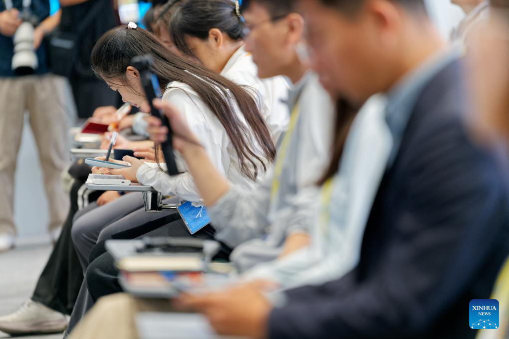 Journalists work during a press briefing of the Ministry of Ecology and Environment of China for the Shanghai Cooperation Organization (SCO) Summit 2025 on the cooperation on ecological and environmental issues of the SCO at Tianjin Meijiang Convention Center in north China's Tianjin, Aug. 30, 2025. The press briefing was held here by the media center of SCO Summit 2025 on Saturday. (Xinhua/Dai Mingxuan)