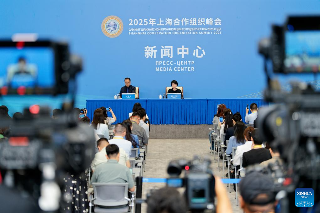 Guo Fang (R, back), vice minister of the Ministry of Ecology and Environment of China, speaks during a press briefing of the ministry for the Shanghai Cooperation Organization (SCO) Summit 2025 on the cooperation on ecological and environmental issues of the SCO at Tianjin Meijiang Convention Center in north China's Tianjin, Aug. 30, 2025. The press briefing was held here by the media center of SCO Summit 2025 on Saturday. (Xinhua/Zhang Xiaoyu)