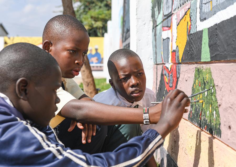 Under the guidance of professional visual artists, a group of Kenyan students put finishing touches on massive, glossy murals celebrating the Chinese-built Mombasa-Nairobi Standard Gauge Railway's role in connecting people and cultures.