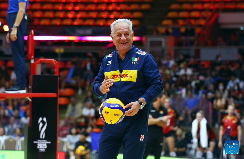 Julio Velasco, head coach of Italy, reacts during the round of 16 match between Italy and Germany at the Volleyball Women's World Championship in Bangkok, Thailand, Aug. 30, 2025. (Xinhua/Sun Weitong)