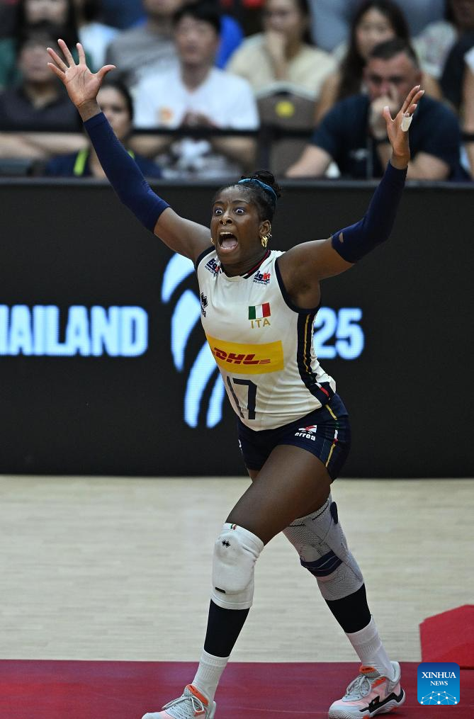 Paola Ogechi Egonu (Top C) of Italy spikes the ball during the round of 16 match between Italy and Germany at the Volleyball Women's World Championship in Bangkok, Thailand, Aug. 30, 2025. (Xinhua/Sun Weitong)
