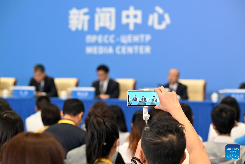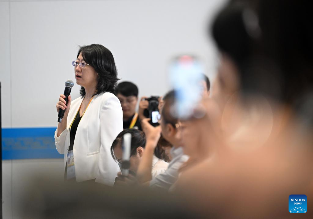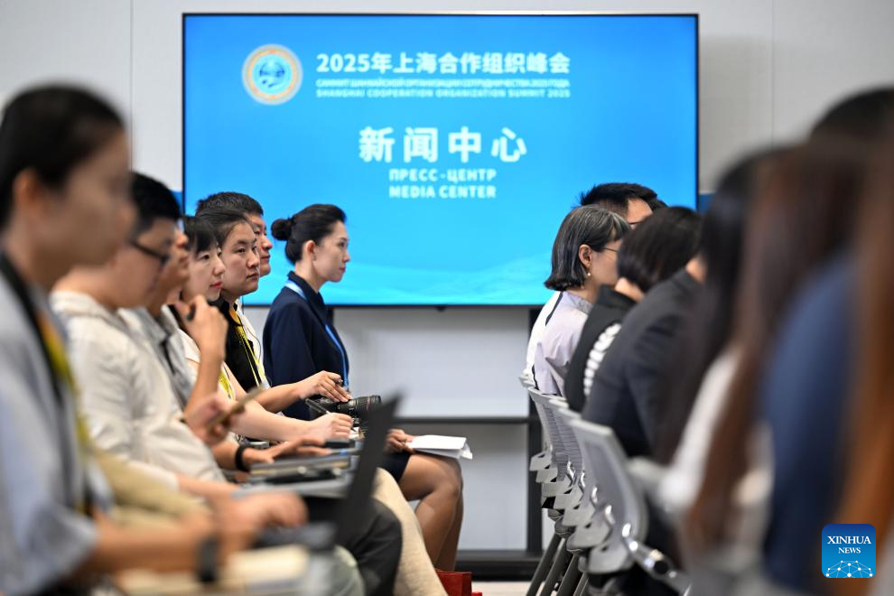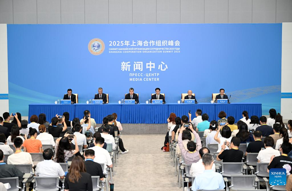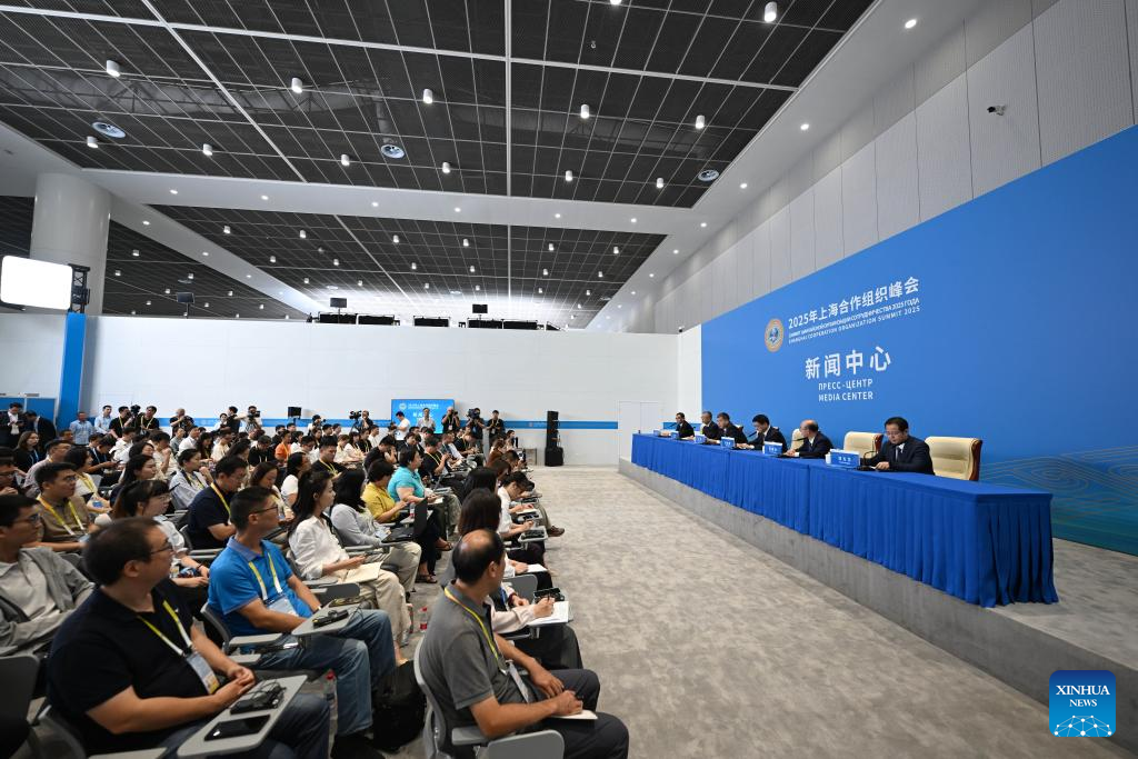 The press briefing for the Shanghai Cooperation Organization (SCO) Summit 2025 (special session of Tianjin Municipality) is held at the media center for the SCO Summit 2025 in north China's Tianjin on Aug. 29, 2025. (Xinhua/Zhao Zishuo)