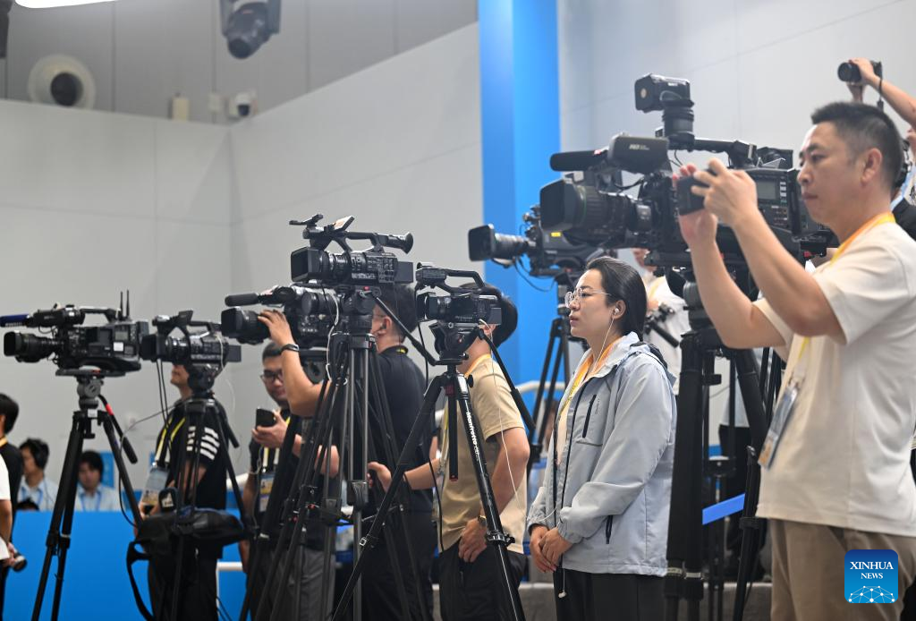 Journalists work at the press briefing for the Shanghai Cooperation Organization (SCO) Summit 2025 (special session of Tianjin Municipality) at the media center for the SCO Summit 2025 in north China's Tianjin on Aug. 29, 2025. (Xinhua/Zhao Zishuo)