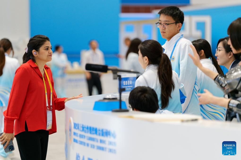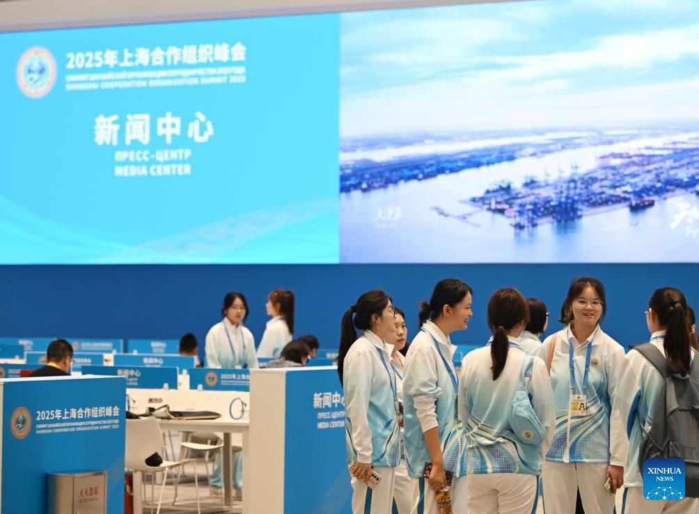 Volunteers are pictured at the media center for the Shanghai Cooperation Organization (SCO) Summit 2025 in north China's Tianjin on Aug. 28, 2025. The upcoming Shanghai Cooperation Organization (SCO) Tianjin Summit is scheduled for Aug. 31 and Sept. 1 in north China's port city of Tianjin. (Xinhua/Li Ran)