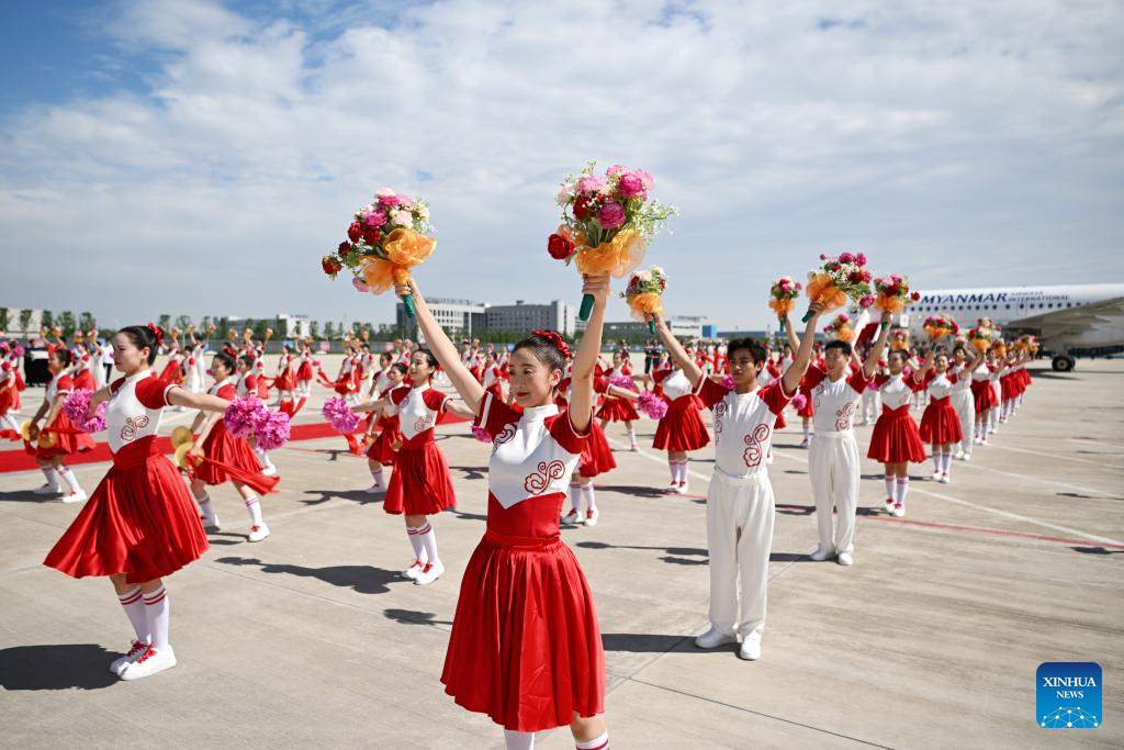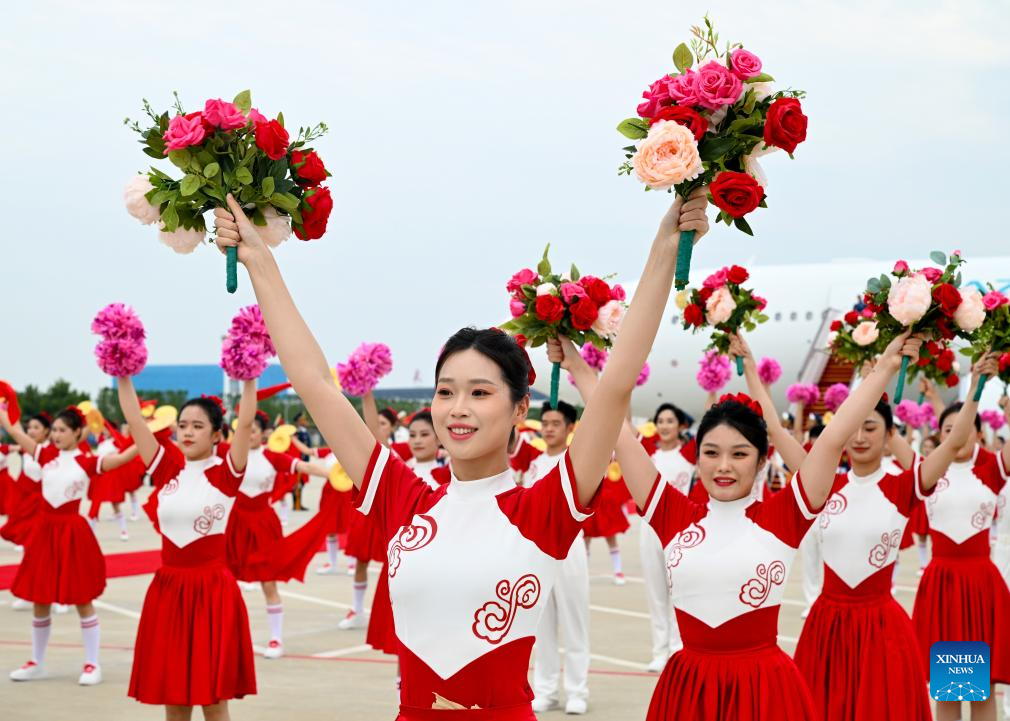 Staff members welcome guests at the Tianjin Binhai International Airport in north China's Tianjin, Aug. 30, 2025. The upcoming Shanghai Cooperation Organization (SCO) Tianjin Summit is scheduled for Aug. 31 and Sept. 1 in north China's port city of Tianjin. (Xinhua/Li Ran)