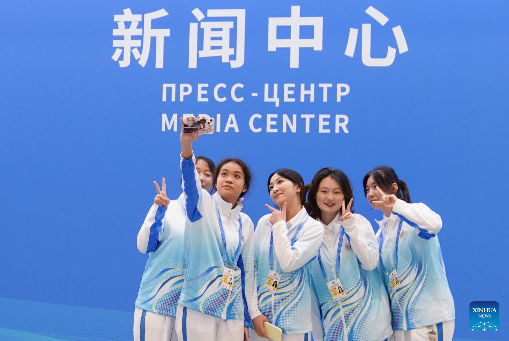 Volunteers pose for a selfie at the media center for the Shanghai Cooperation Organization (SCO) Summit 2025 in north China's Tianjin on Aug. 30, 2025. The upcoming Shanghai Cooperation Organization (SCO) Tianjin Summit is scheduled for Aug. 31 and Sept. 1 in north China's port city of Tianjin. (Xinhua/Dai Mingxuan)