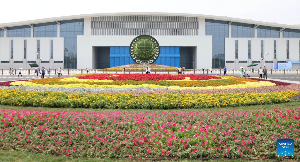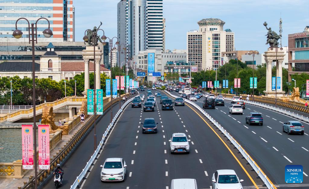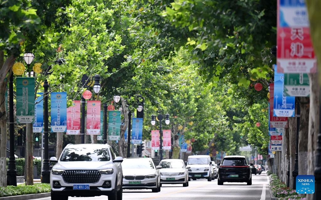 This photo taken on Aug. 28, 2025 shows decorations for the Shanghai Cooperation Organization (SCO) Summit 2025 in north China's Tianjin on Aug. 28, 2025. The upcoming Shanghai Cooperation Organization (SCO) Tianjin Summit is scheduled for Aug. 31 and Sept. 1 in north China's port city of Tianjin. (Xinhua/Zhao Zishuo)