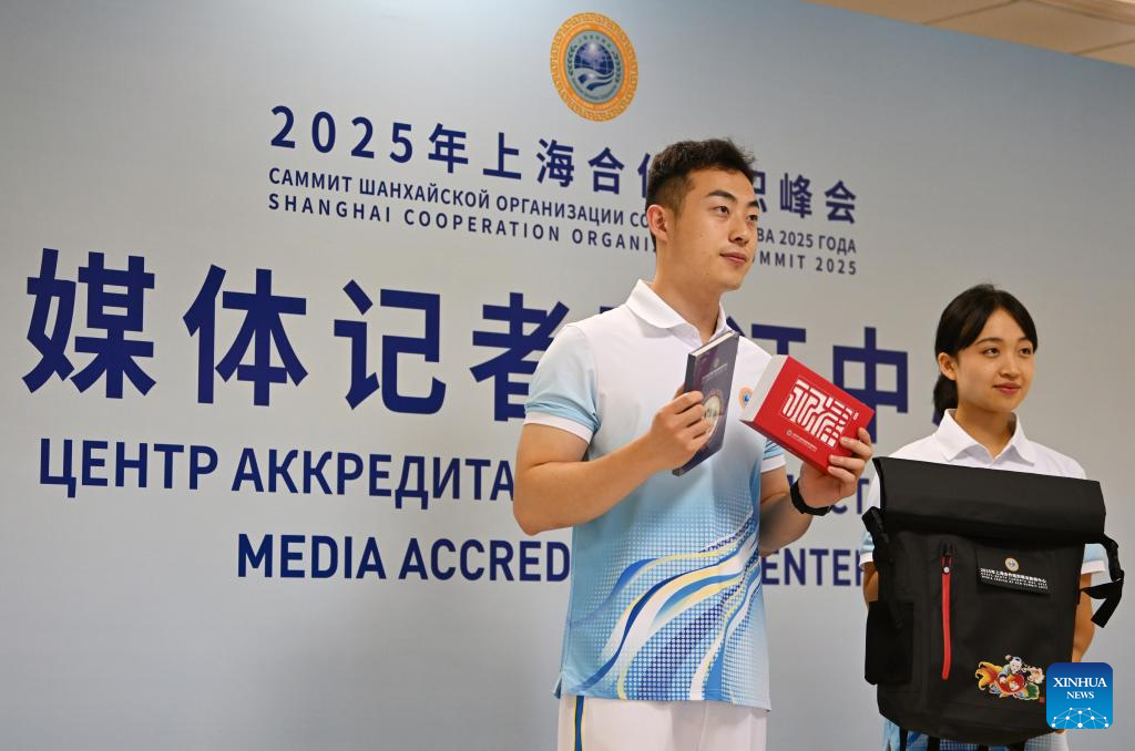 Volunteers display media bag sample at the media center for the Shanghai Cooperation Organization (SCO) Summit 2025 in north China's Tianjin on Aug. 27, 2025. The upcoming Shanghai Cooperation Organization (SCO) Tianjin Summit is scheduled for Aug. 31 and Sept. 1 in north China's port city of Tianjin. (Xinhua/Li Ran)
