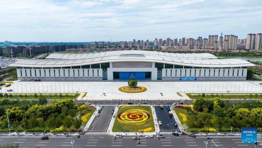 An aerial drone photo taken on Aug. 28, 2025 shows an exterior view of the main venue of the Shanghai Cooperation Organization (SCO) Summit 2025 in north China's Tianjin. The upcoming Shanghai Cooperation Organization (SCO) Tianjin Summit is scheduled for Aug. 31 and Sept. 1 in north China's port city of Tianjin. (Xinhua/Zhao Zishuo)
