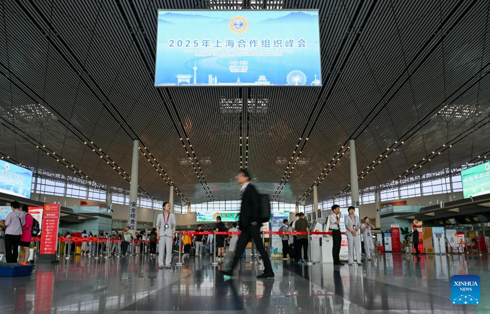 A banner of the Shanghai Cooperation Organization (SCO) Summit 2025 is pictured at the Tianjin Binhai International Airport in north China's Tianjin on Aug. 27, 2025. The upcoming Shanghai Cooperation Organization (SCO) Tianjin Summit is scheduled for Aug. 31 and Sept. 1 in north China's port city of Tianjin. (Xinhua/Sun Fanyue)