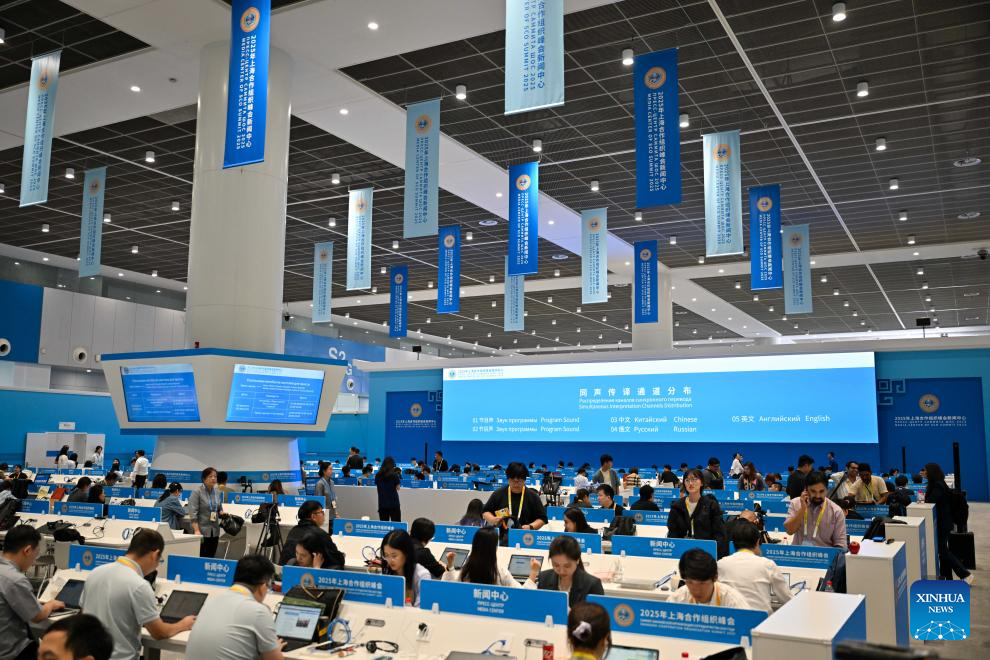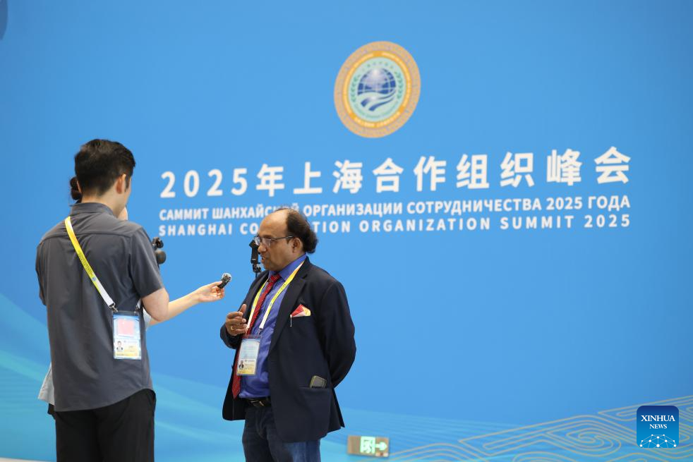 Foreign reporters work at the media center for the Shanghai Cooperation Organization (SCO) Summit 2025 in north China's Tianjin on Aug. 30, 2025. The upcoming Shanghai Cooperation Organization (SCO) Tianjin Summit is scheduled for Aug. 31 and Sept. 1 in north China's port city of Tianjin. (Xinhua/Zhang Xiaoyu)