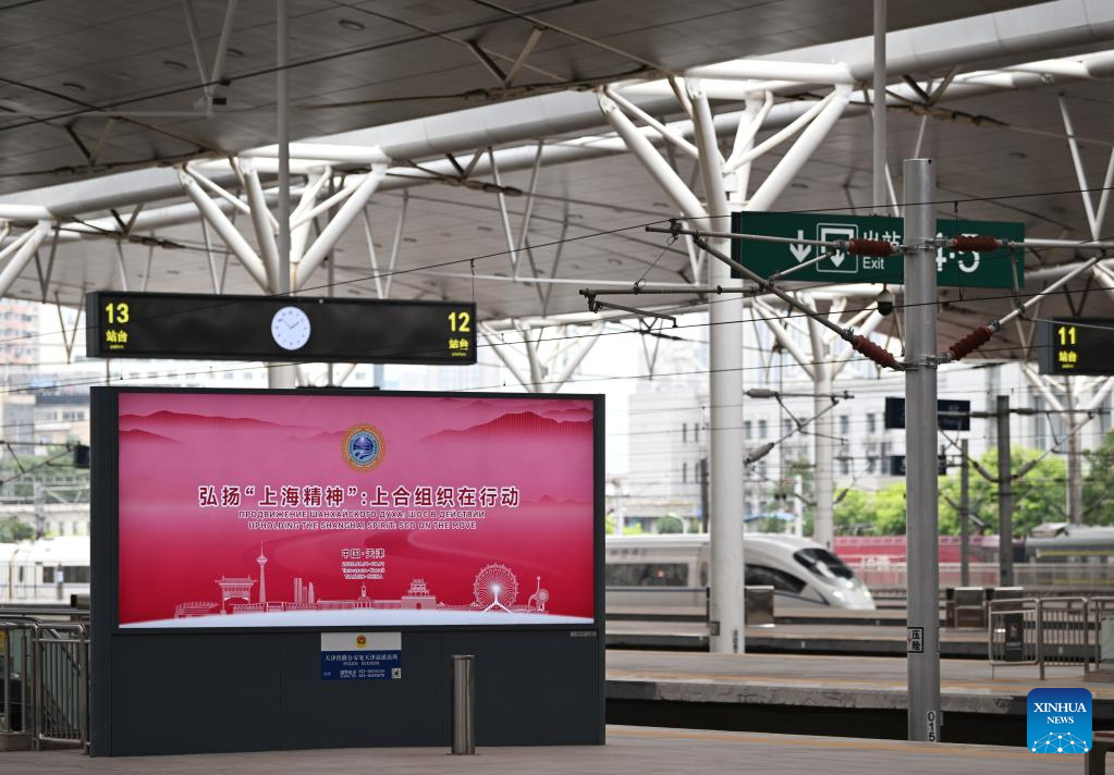 This photo taken on Aug. 27, 2025 shows a banner of the Shanghai Cooperation Organization (SCO) Summit 2025 at the Tianjin Railway Station in Tianjin, north China. The upcoming Shanghai Cooperation Organization (SCO) Tianjin Summit is scheduled for Aug. 31 and Sept. 1 in north China's port city of Tianjin. (Xinhua/Li Ran)