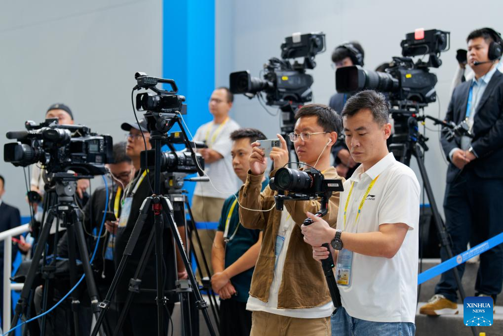 Journalists work at the press briefing for the Shanghai Cooperation Organization (SCO) Summit 2025 (special session of Shaanxi Province) at the media center for the SCO Summit 2025 in north China's Tianjin, Aug. 30, 2025. (Xinhua/Zhang Xiaoyu)