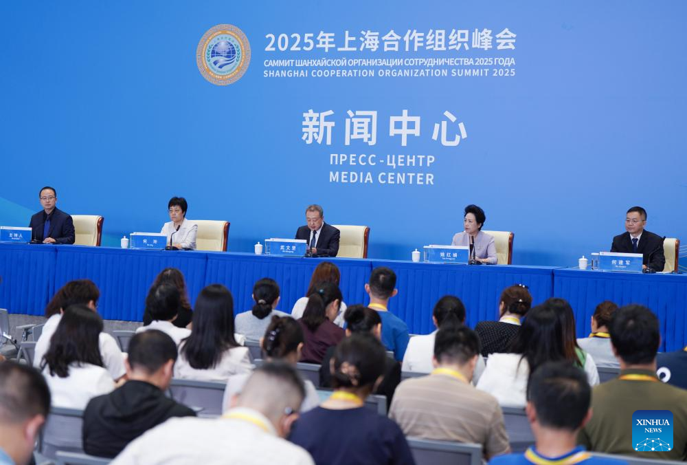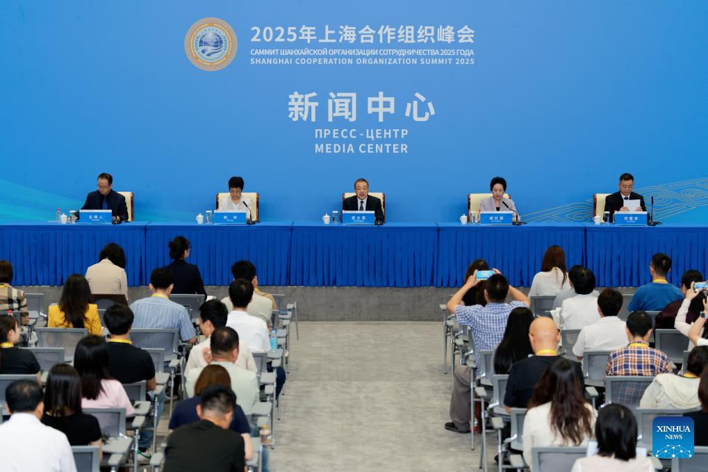 The press briefing for the Shanghai Cooperation Organization (SCO) Summit 2025 (Special Session of Shaanxi Province) is held at the media center for the SCO Summit 2025 in north China's Tianjin on Aug. 30, 2025. (Xinhua/Dai Mingxuan)