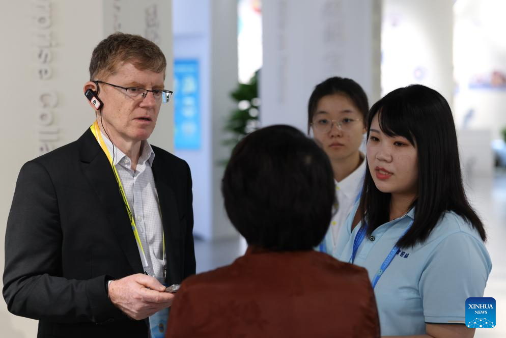 A British journalist conducts an interview at the Lu Ban Workshop Experience Museum of Tianjin Light Industry Vocational Technical College, in Tianjin, north China, on Aug. 30, 2025. Multiple city visiting events have been arranged in Tianjin by the media center of the Shanghai Cooperation Organization (SCO) Summit 2025 from Aug. 28 to Aug. 30, providing opportunities for Chinese and foreign journalists to learn about distinctive highlights in Tianjin's history and culture, its scientific and technological development, cultural and people-to-people exchanges, as well as other fields during their visits. (Xinhua/Sun Fanyue)