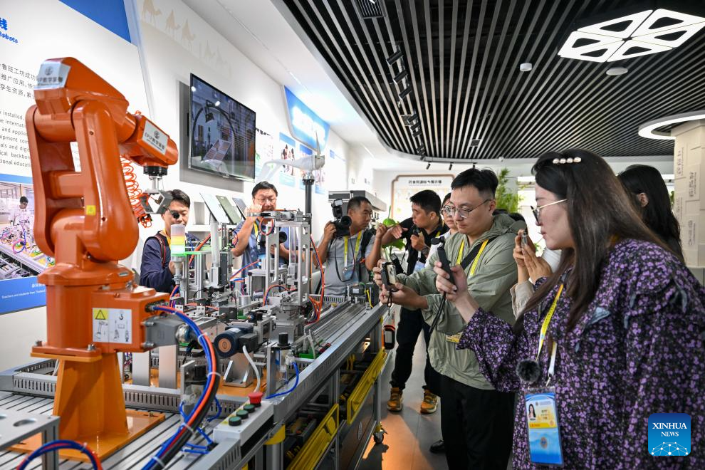 Journalists learn about the industrial robot training equipment at the Lu Ban Workshop Experience Museum of Tianjin Light Industry Vocational Technical College, in Tianjin, north China, on Aug. 30, 2025. Multiple city visiting events have been arranged in Tianjin by the media center of the Shanghai Cooperation Organization (SCO) Summit 2025 from Aug. 28 to Aug. 30, providing opportunities for Chinese and foreign journalists to learn about distinctive highlights in Tianjin's history and culture, its scientific and technological development, cultural and people-to-people exchanges, as well as other fields during their visits. (Xinhua/Sun Fanyue)