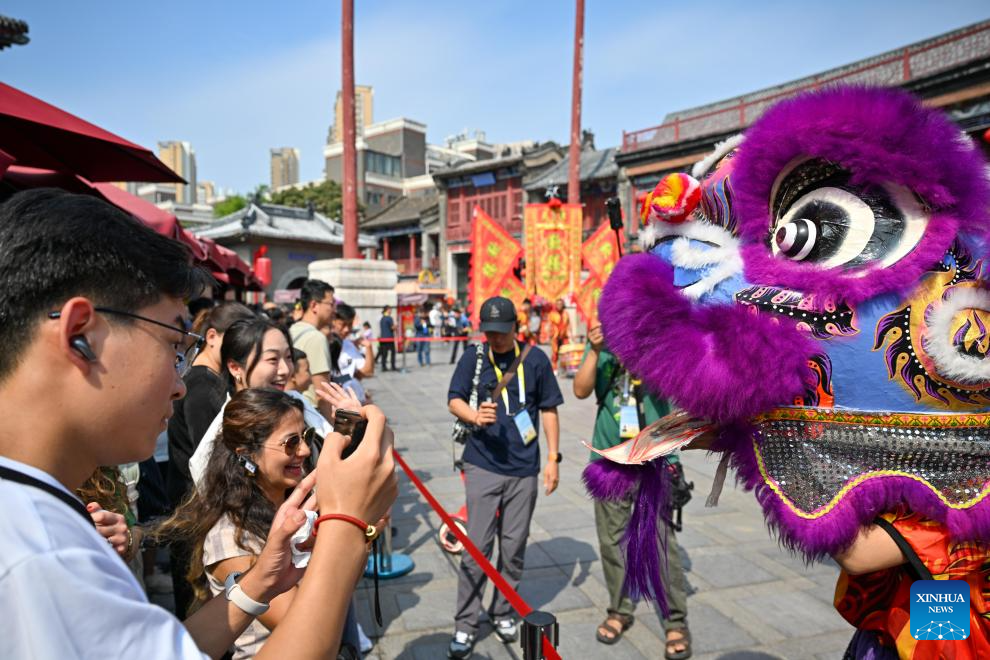 Journalists watch a lion dance performance at a square on the Tianjin Ancient Culture Street in Tianjin, north China, on Aug. 29, 2025. Multiple city visiting events have been arranged in Tianjin by the media center of the Shanghai Cooperation Organization (SCO) Summit 2025 from Aug. 28 to Aug. 30, providing opportunities for Chinese and foreign journalists to learn about distinctive highlights in Tianjin's history and culture, its scientific and technological development, cultural and people-to-people exchanges, as well as other fields during their visits. (Xinhua/Sun Fanyue)