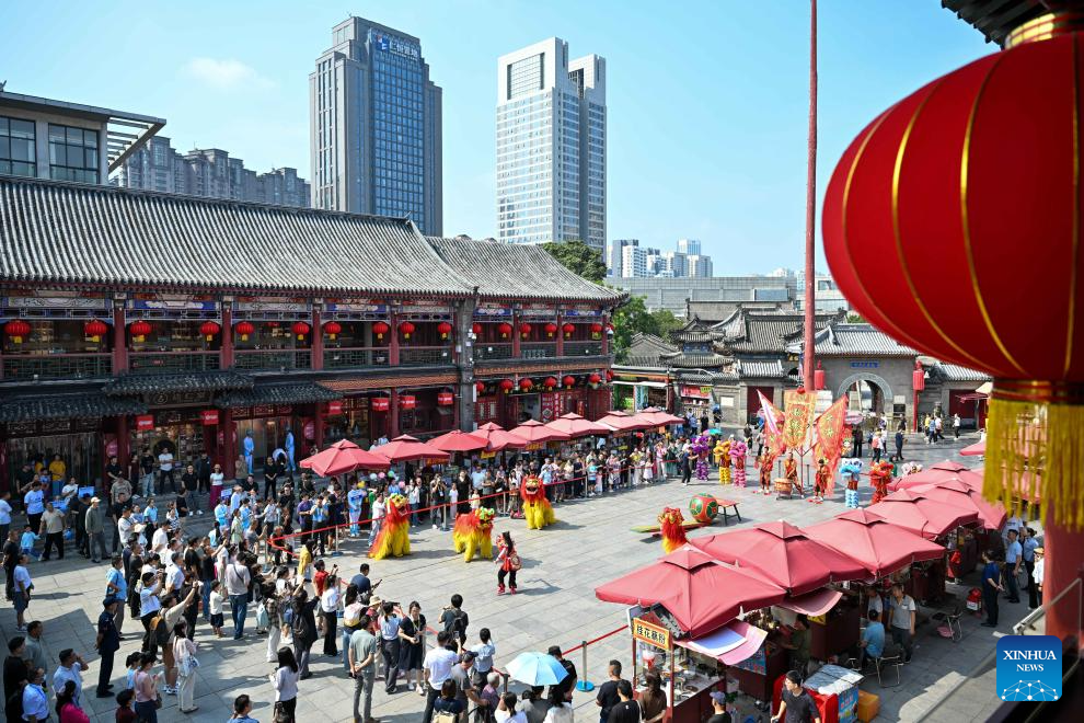 Journalists watch a lion dance performance with citizens at a square on the Tianjin Ancient Culture Street in Tianjin, north China, on Aug. 29, 2025. Multiple city visiting events have been arranged in Tianjin by the media center of the Shanghai Cooperation Organization (SCO) Summit 2025 from Aug. 28 to Aug. 30, providing opportunities for Chinese and foreign journalists to learn about distinctive highlights in Tianjin's history and culture, its scientific and technological development, cultural and people-to-people exchanges, as well as other fields during their visits. (Xinhua/Sun Fanyue)