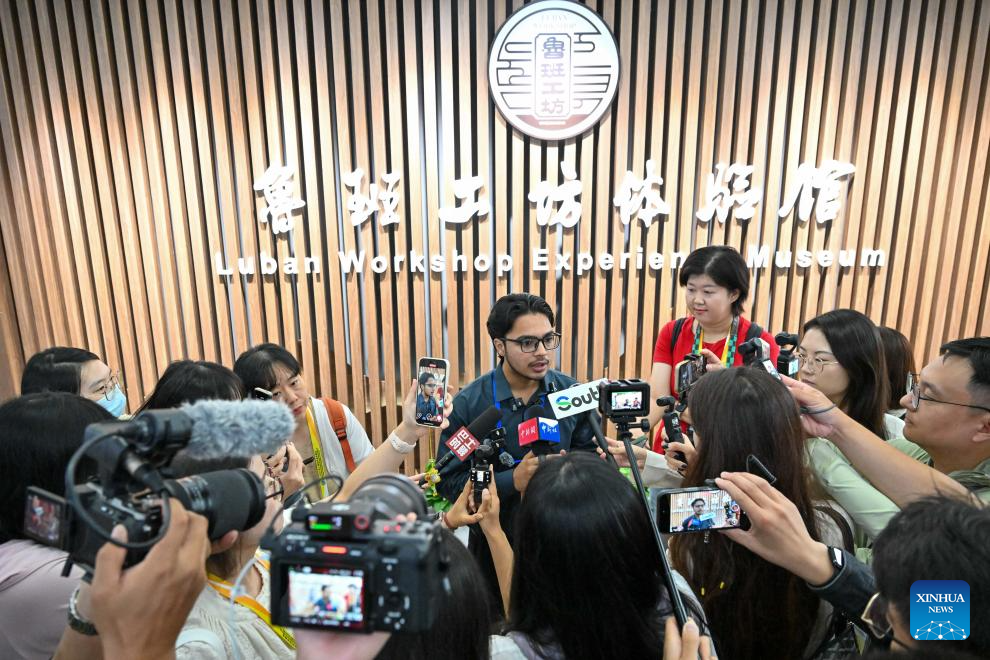 A Pakistani student with Lu Ban Workshop of Tianjin Light Industry Vocational Technical College receives an interview at the Lu Ban Workshop Experience Museum of the college in Tianjin, north China's, on Aug. 30, 2025. Multiple city visiting events have been arranged in Tianjin by the media center of the Shanghai Cooperation Organization (SCO) Summit 2025 from Aug. 28 to Aug. 30, providing opportunities for Chinese and foreign journalists to learn about distinctive highlights in Tianjin's history and culture, its scientific and technological development, cultural and people-to-people exchanges, as well as other fields during their visits. (Xinhua/Sun Fanyue)