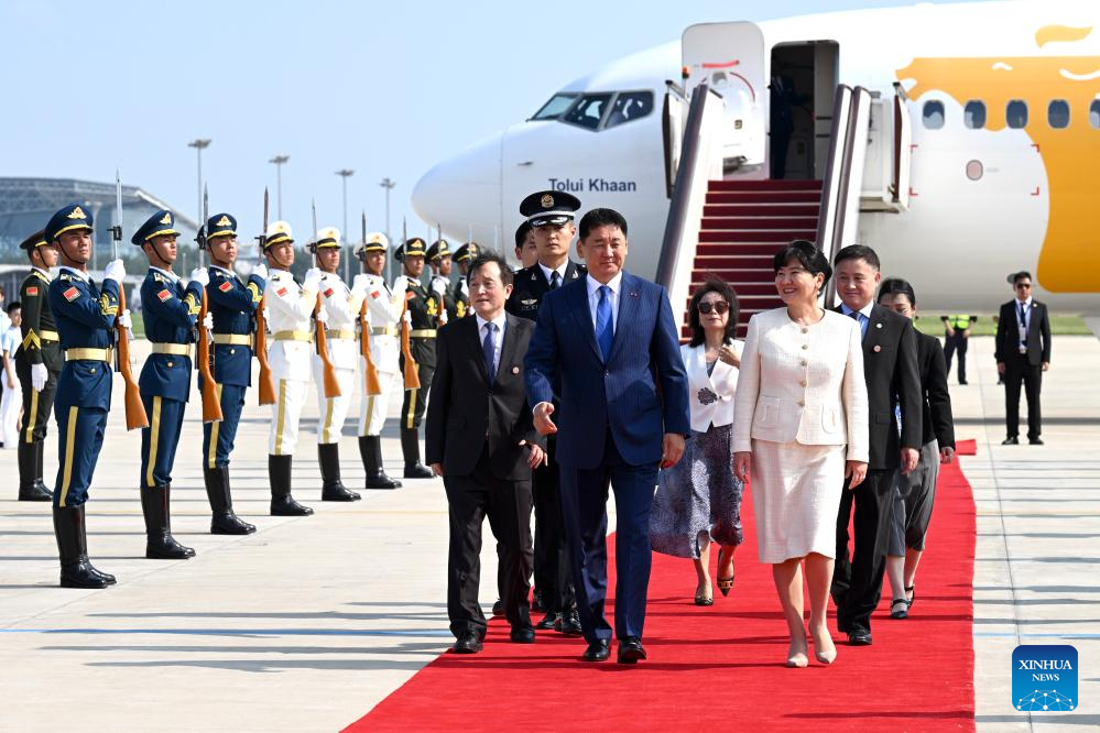 Mongolian President Ukhnaa Khurelsukh arrives for the Shanghai Cooperation Organization (SCO) Summit 2025 in Tianjin, north China, Aug. 31, 2025. (Xinhua/Huang Bohan)